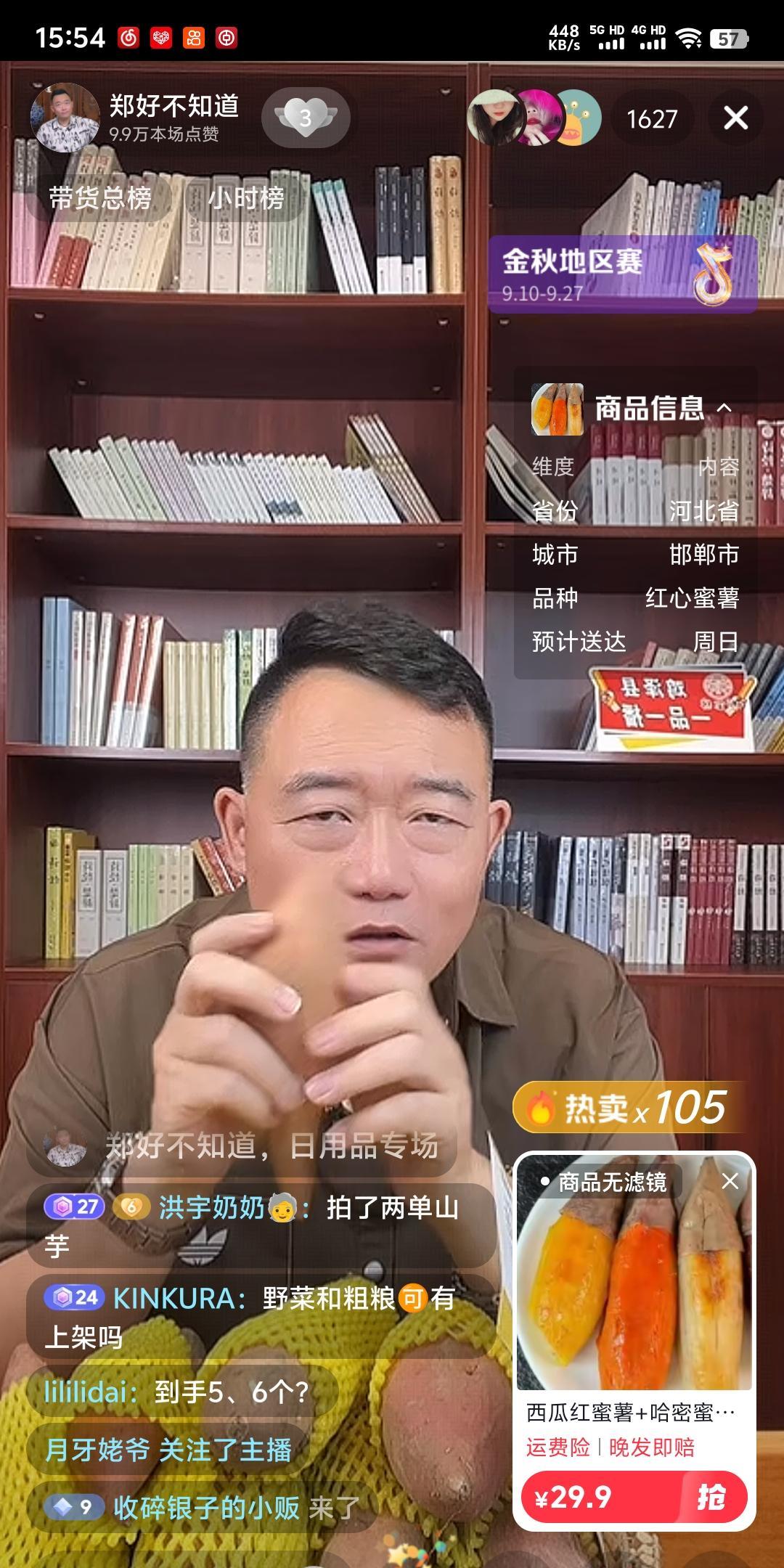 郑好下午助农带货直播,我从3点半看到4点,我发现郑好跟其他主播不大一样。 一般的主播都会跟着助播的节奏走,然后配合助播的话去描述产品,而郑好则是一直用自己的方式去说话。 就比如他在卖红薯的时候,助理告诉他这个产品一共发三种红薯。 正常的主播就会随着助播的指导,给观众展示和介绍三种品种是什么。 而郑好则表示,他对农业知识了解得少,所以他不知道怎么分。如果此时此刻有人告诉我怎么分,我还能懂,一没人说,根本不会分。 我觉得郑好这样表述特别的真实,不靠话术去让人下单,单纯靠的是真诚。 我原以为郑好去助农,准是卖一些水果类的,没想到是卖地瓜,辣椒酱,芝麻油等等一系列当地的特产。 我认为郑好开了个好头,只要稍微有点人气的主播或是演员,空闲的时候确实可以利用自己的人气去直播带货,去助力一些农产品。 好多人对郑好一直存在一个误解,就是认为他本事没有,完全靠和人对骂才有了人气。 其实但凡你早一点知道郑喜定,就会知道,郭德纲从来不无缘无故给人起外号。 他是看到那个人身上的闪光点了,才会给人起外号,帮助他速成。 郑好下午卖那个地瓜,卖的还不错。
