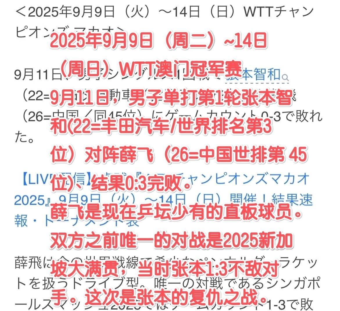 [奸笑]还是日媒会写!张本智和完败给中国直板选手薛飞! 日媒指出张本智和本来是对