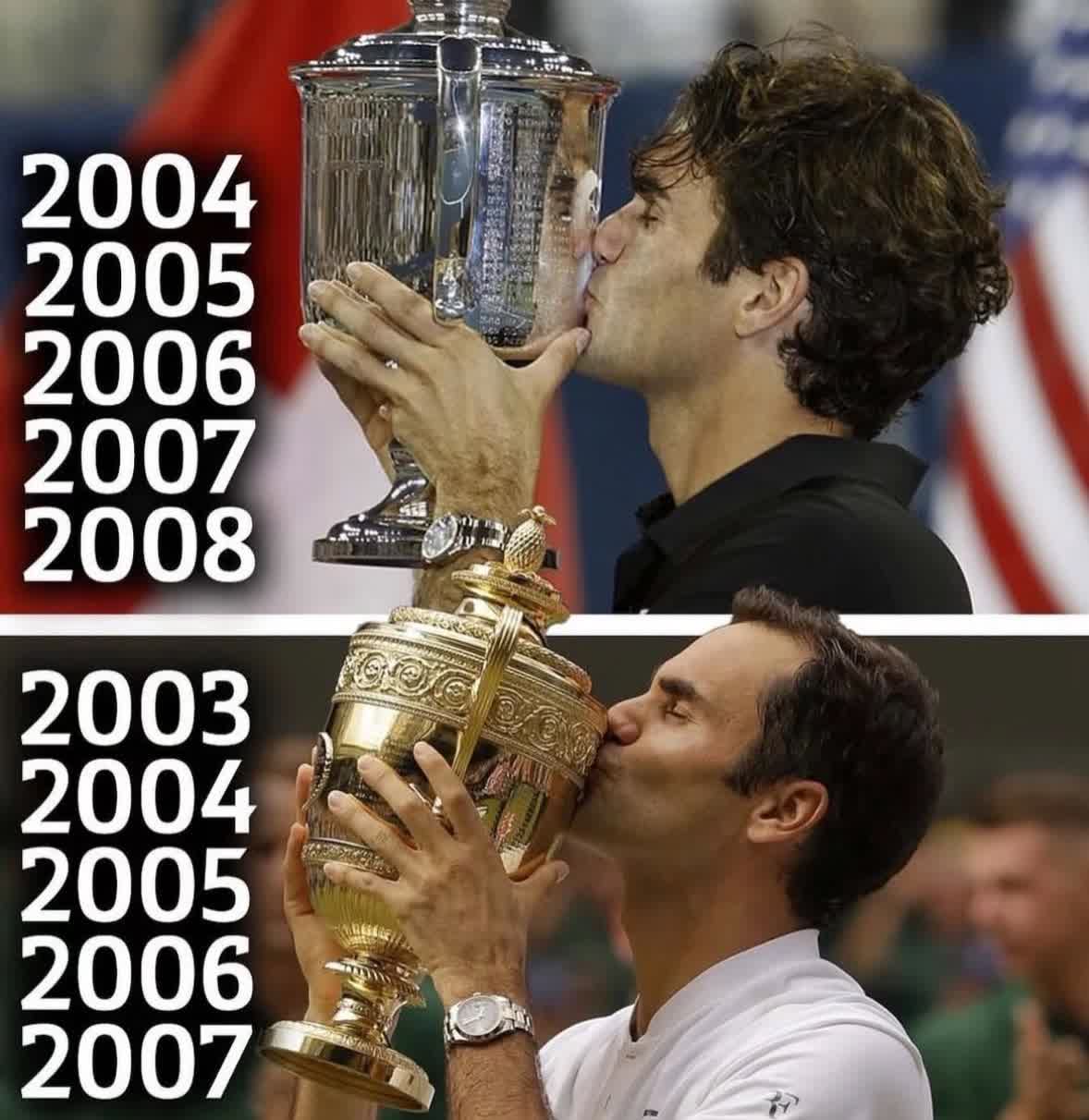 费德勒2004-2008年美网五连冠,绝对是网坛难以复制的神话。 看看