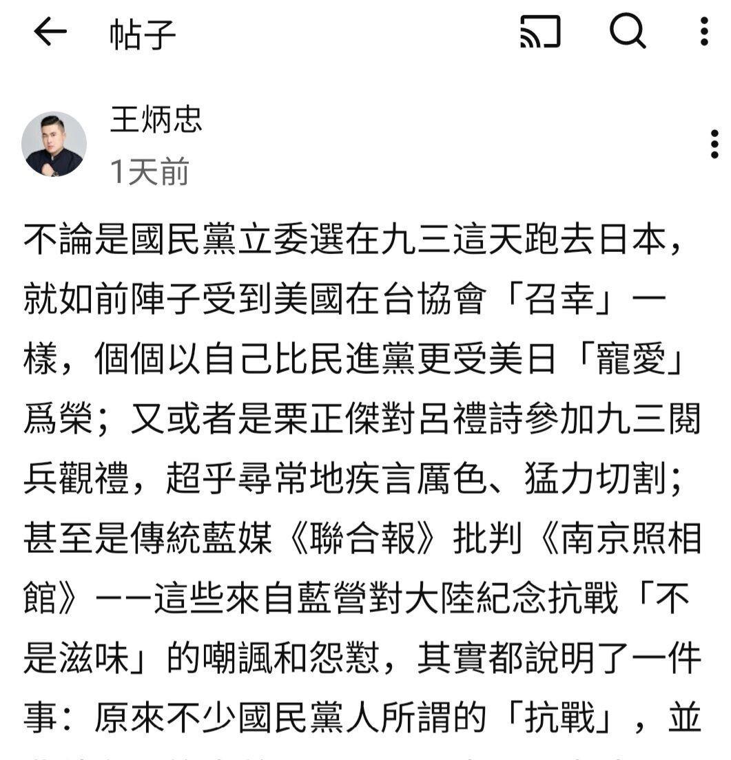 解气!台湾又有一位知名媒体人、爱国同胞批国民党窜日的那27个“民代”,还点名了栗正杰对吕礼诗的疾言厉色! 这位勇敢的爱国人士不是别人,正是宝岛统派中生代的代表性人物王炳忠。 继区桂芝老师批国民党窜日的27位“民代”后,王炳忠先生也发文批国民党里面一些人的行为没有站在民族大义这边,点名了栗正杰,尤其提到国民党“民代”9月3号跑去日本的事情。 在我看来,区桂芝和王炳忠都是勇敢的爱国同胞,是有信仰的统派,他们不怕得罪国民党,他们敢于说出大实话,这非常难得。 我这几天一直在留意蓝营媒体会不会报道国民党“民代”在九月三号这个特殊含义的日子窜去日本的消息,果然没有报道,外网全是绿营媒体在报道,不仅没报道,像中天、tvbs各档政论节目提都不提这个话题,为什么这么严重的事情提都不提?也不报道呢?国民党去日本那27个“民代”当中还有人在拍照时手拿日本国旗,还笑呢,为什么不讨论这个话题?都装作看不见吗?你们蓝营电视节目和网络节目这几天报道和讨论叛徒石平的事件可密集了,实际上九月三号窜日的那些举日本国旗的“民代”与石平之间还差多少? 谁敢保证以后不是一个类型?在我看来都非常严重。 他们蓝营当中一些人口口声声说“抗战”是国民党军队打的,然而在纪念抗战胜利80周年这么重要的日子你们国民党那么多选出来的代表去了日本,还拿日本国旗笑着拍照,这在打谁的脸?够不够丢人的?越是这样越得不到别人的尊重,就像石平一样,背叛者到哪里都不受待见!所以你们国民党到哪里都让人讨厌是有原因的,自己不争气,除了嘴硬还有啥? 还有骨头软和小心眼,争功时没人有你们那么能说,对内没人有你们那么狠,但关键时候掉链子扑通下跪也没人比你们快。 好自为之吧!坏人,尤其叛徒绝对没有好下场。