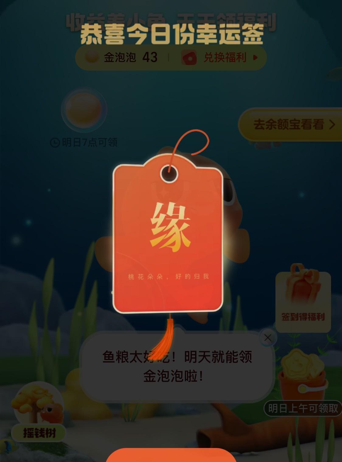 支付宝“芭芭农场”鱼塘里的小鱼,很好养,每天吐出的金泡泡,可以兑换余额宝体验金。
