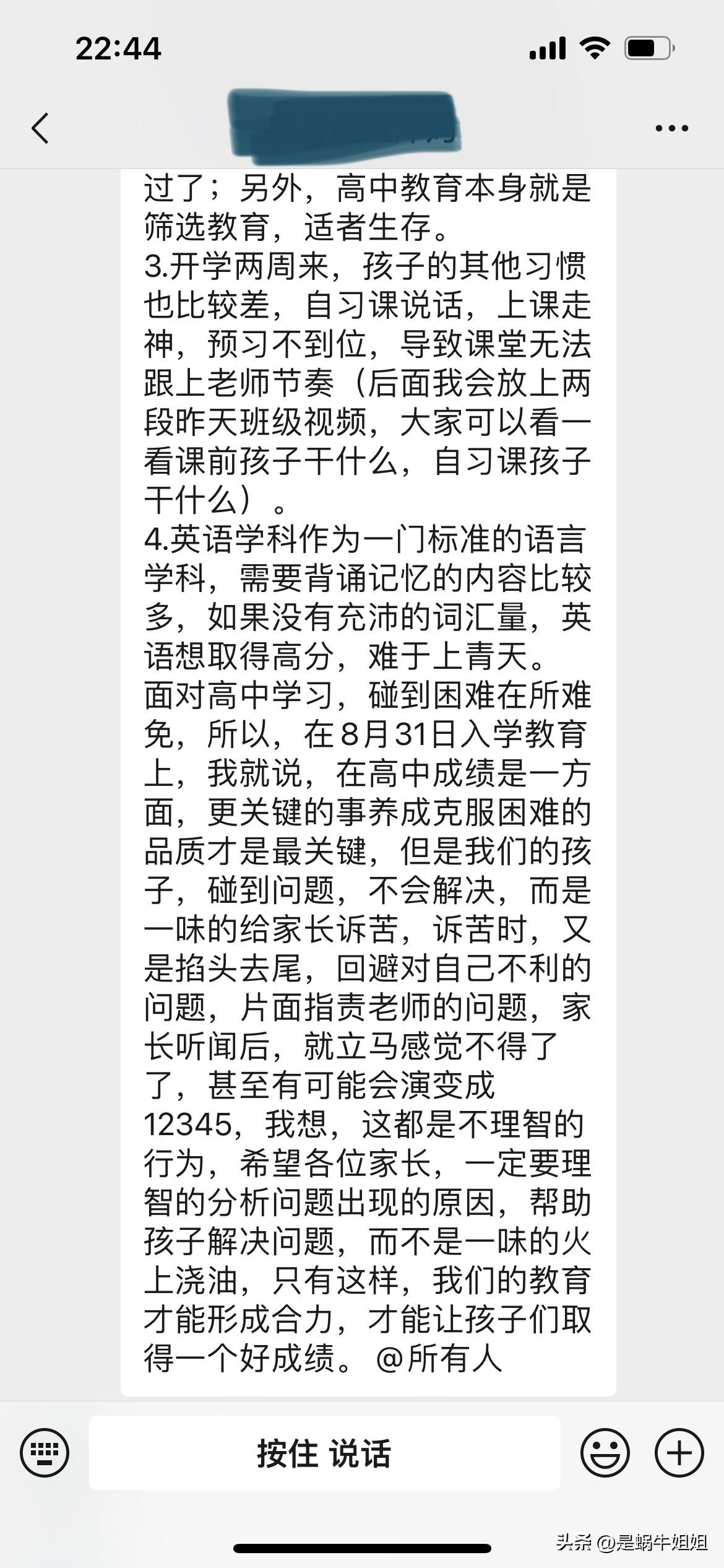 娃的同学高中去了历城*中,下午孩子打电话来,哭的稀里哗啦,说吃不上饭,一问吃饭是要跑着抢的,孩子不争不抢的性格,等他排到,想吃的饭已经没了。也洗不上澡,学校的洗澡间是个大间,要洗澡就得“坦诚相见”,孩子不好意思,一直没洗。最崩溃的,老师讲课很快,英语老师蹦着讲,讲半天了,还没找到题呢。。。崩溃了。 孩子一哭,家长也破防了,赶紧找班主任了解情况,于是班主任在班级群发了这么一篇。。。 高中和初中确实是两个阶段,一个义务教育,一个要筛选、要淘汰。别说孩子不适应,家长也得调整。 看老师发的,也确实是这个道理,但总觉得压迫感满满,看来高中老师已经不给家长和学生提供情绪价值了,打直球,慢慢接受吧。