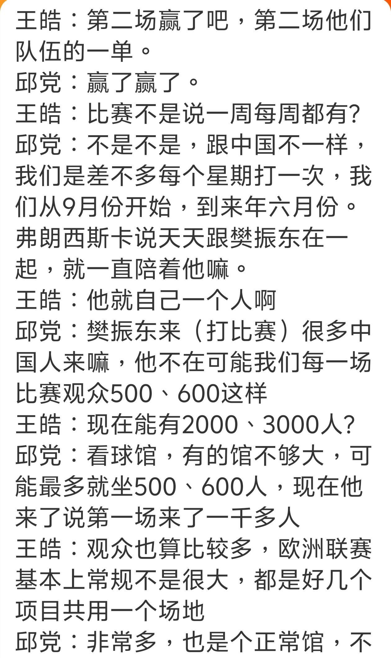 王皓跟邱党的聊天被网友录音后传播出来了。 本来只是两人的闲聊,但王皓每一句话都是在旁敲侧击打听樊振东目前在德甲的状况。看来樊振东去德甲打比赛跟王皓应该没有沟通过,而且也很久没有联系了,所以王皓才会跟邱党打听小胖近况的。 但是王皓还问邱党林高远是不是也打欧冠杯? 要知道小胖和高远都还是国家队的现役队员,作为国家队男队主教练,自己手下两位主力出国打联赛怎么像是什么都知道似的?为什么现在才想起关心他们来了?不过,王皓不知道这些事,并不等于教练组和乒协不知道。 当邱党说小胖在德国弗朗西斯卡天天陪着他时,王皓听后却有感而发地说:他就自己一个人啊! 你也知道小胖自己一个人在海外孤独吧?你还记得当初你们在巴黎并肩作战,为捍卫祖国的荣耀一起奋斗过吗?当小胖夺冠你们俩一起圆梦巴黎时,你激动地将小胖高高举起……那场面还历历在目啊!而现在,你们像是陌生人,你想知道他近况却还要通过外协队员去打听,为什么不再跟他联系了呢?如果樊振东不是被逼退出世排没球打,他用得着一个人漂洋过海去打商业联赛吗?