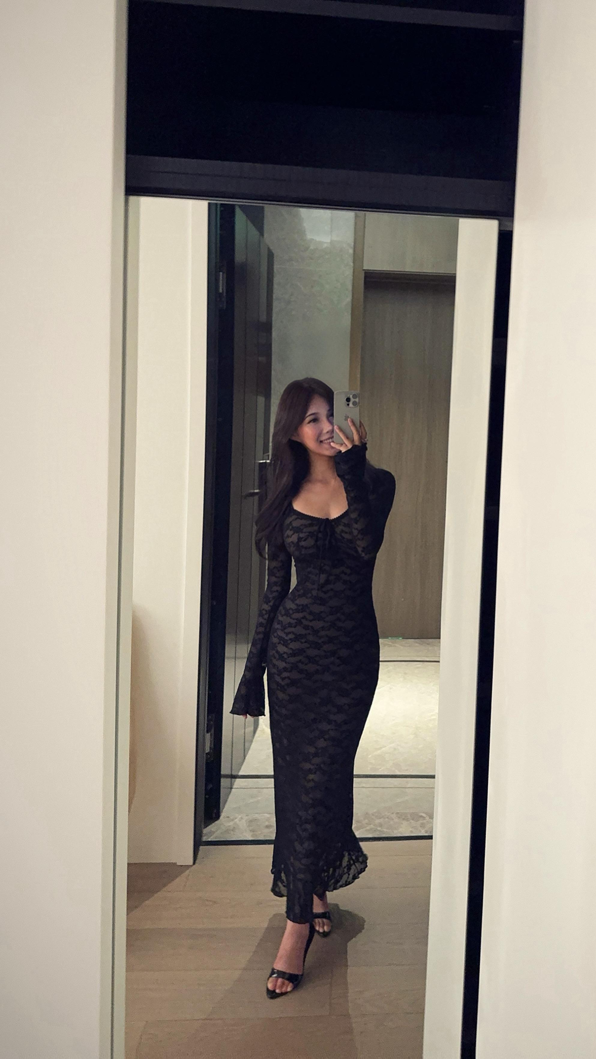 这位女士的穿搭展现了优雅与性感的完美平衡。她身着一件蓝色蕾丝拼接连衣裙,上半身采