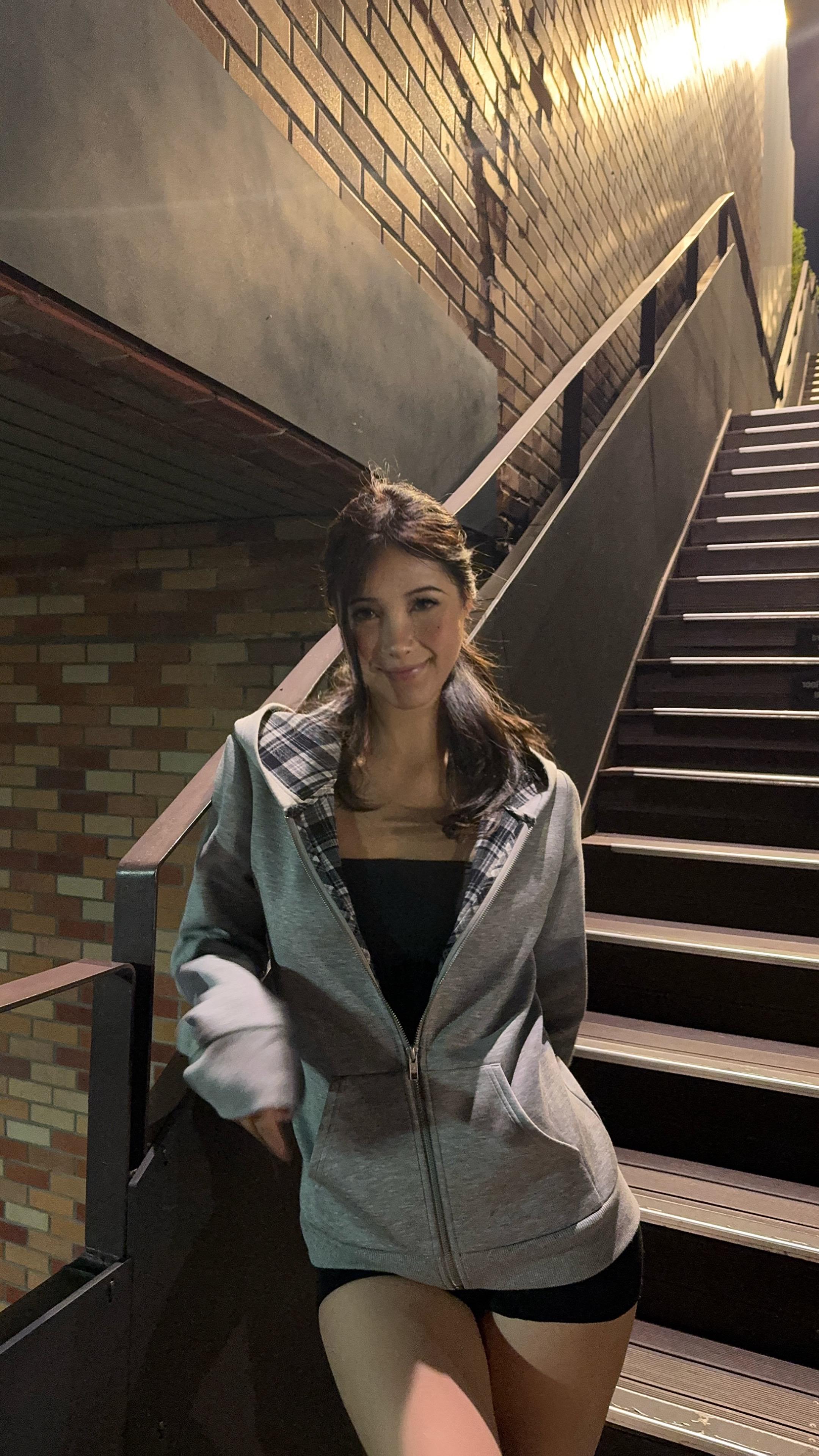 运动后放松时刻,穿红色卫衣,享受宁静时光。