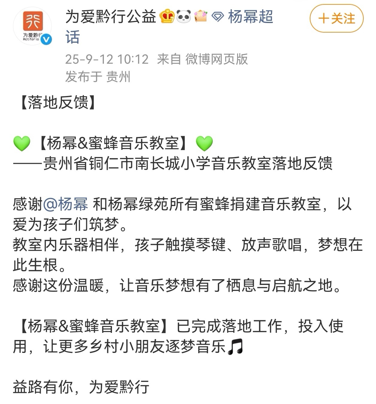 杨幂粉丝为贵州省铜仁市南长城小学捐建音乐教室[手指比心]