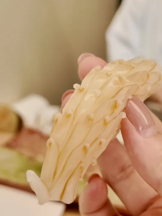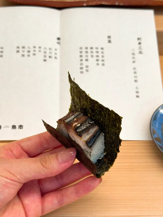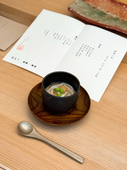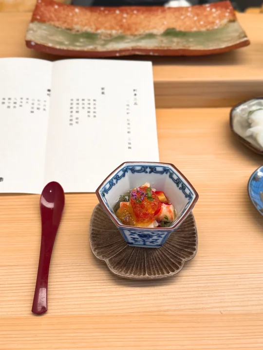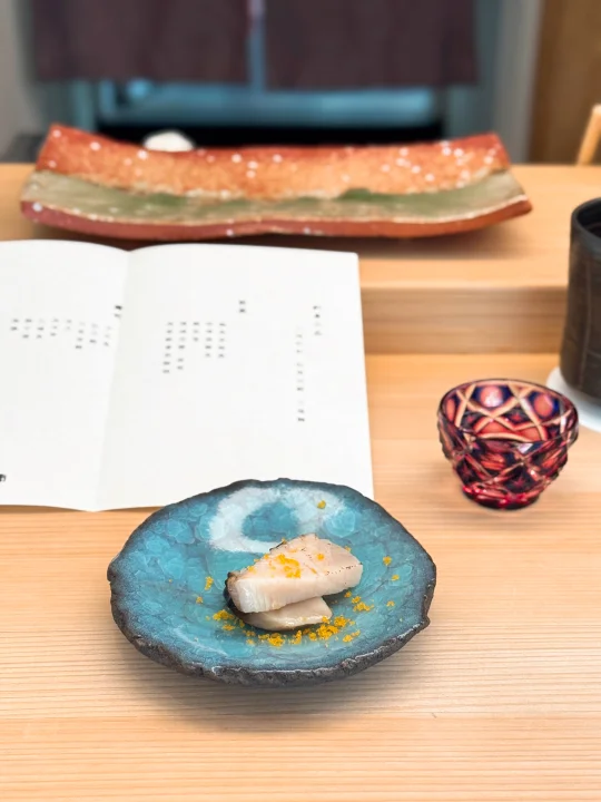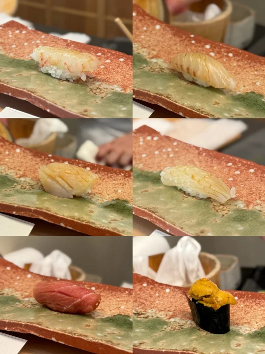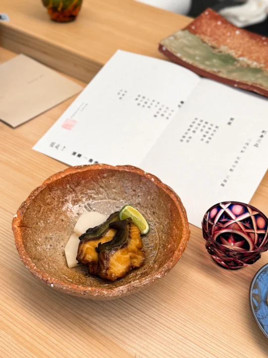 寿司部分,白星笛鲷、九繪鱼来自活缔,帆立贝、枪乌贼来自植庭——食材本身没问题,鲜度、甜度都在线,枪乌贼的糯感也处理得不错。但或许正因为两家风格都太鲜明,反而没有产生“1+1>2”的惊艳效果。熟成鱼的风味表达略显保守,没有在活缔本店那种冲击力。