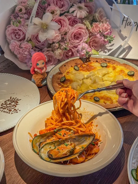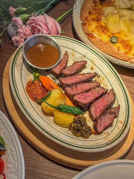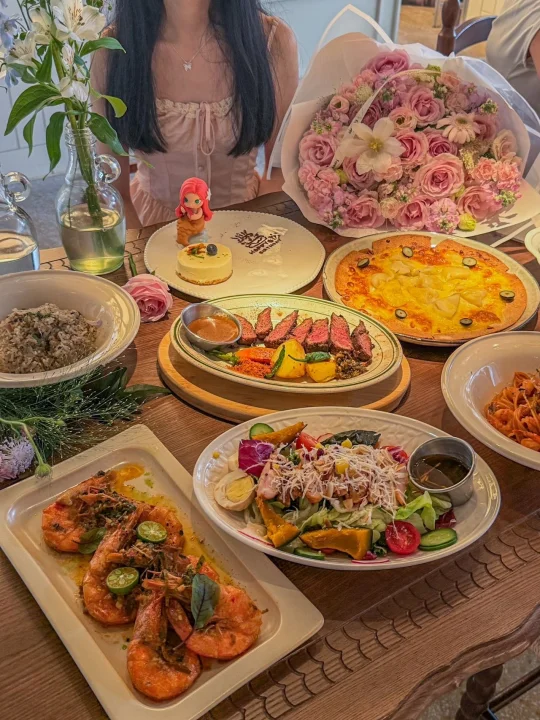 整个餐厅被鲜花瀑布360°包围 连餐盘边都洒满新鲜花瓣💐 拍照根本不需要打光 整个人都在花影里自带柔焦! 果木炭烤厚切牛排 法式庄园的仪式感 牛排带着淡淡果木甜香 厚切的,口感很满足,解馋 黑松露牛肝菌烩饭 黑松露片香到上头! 每粒米都裹满奶油和菌菇香 这个店约会太浪漫了,整个店都是小姐姐在拍照!