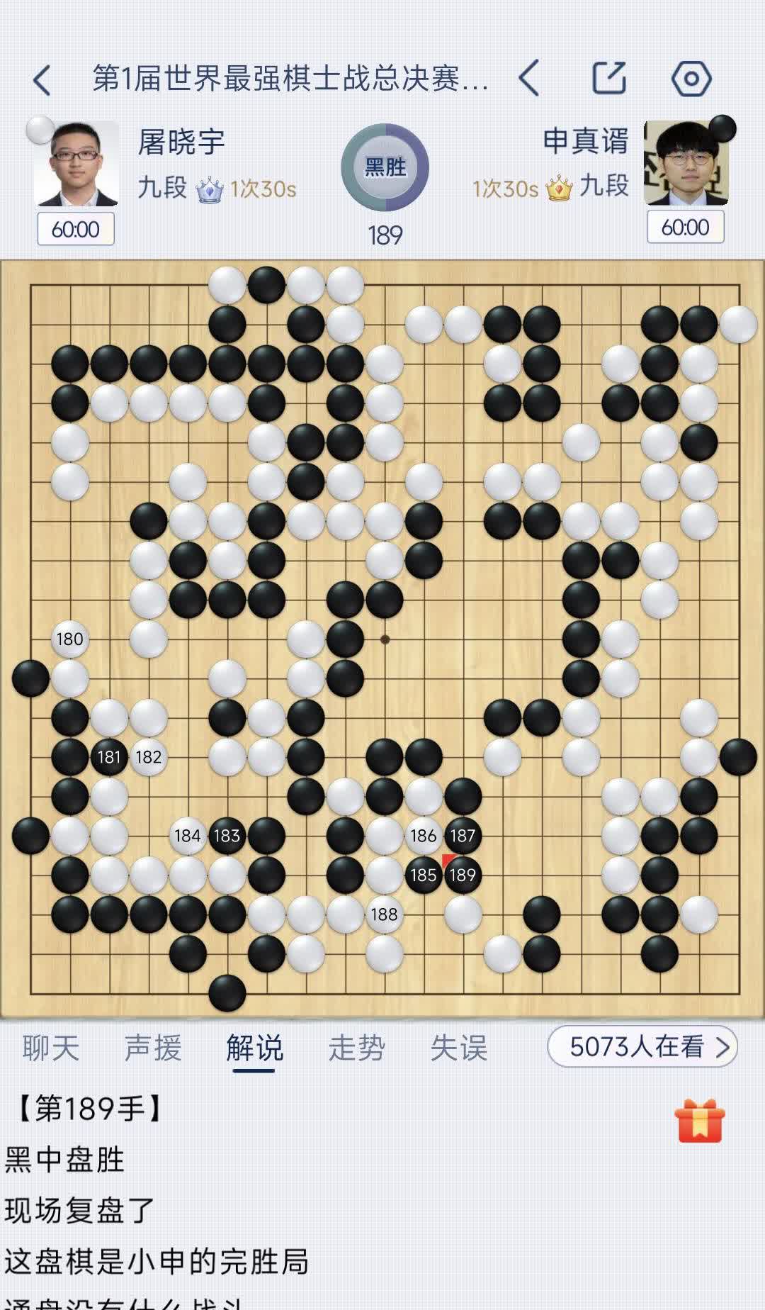 刚刚,最强棋士战决赛,申真谞扳回一局,明天决战! 这局是申真谞的好局,控制流得