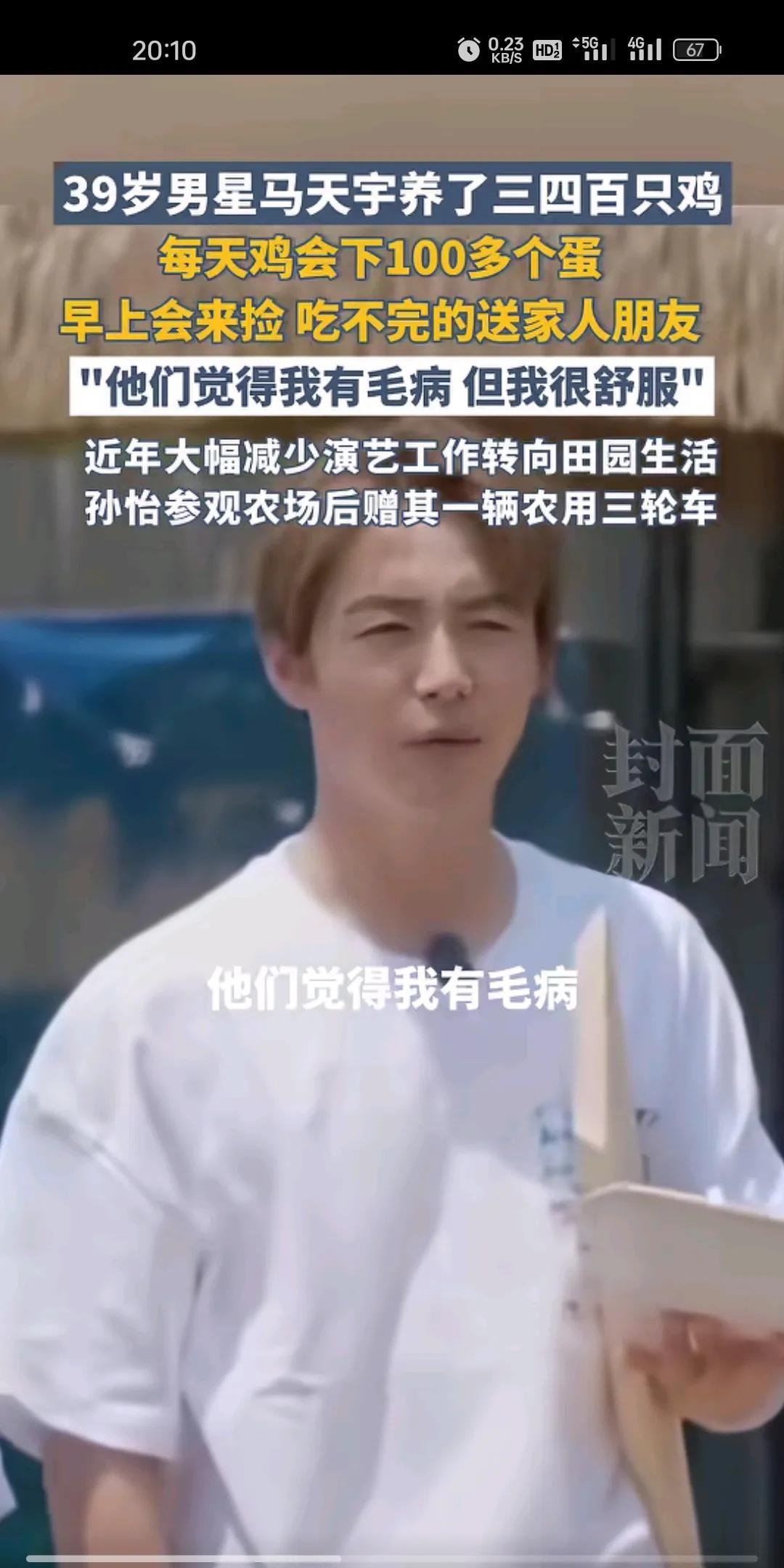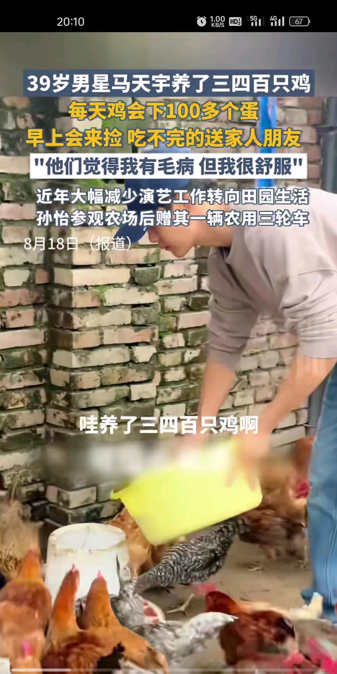 马天宇:他们觉得我有毛病,但我很舒服。 我现在好像能理解他了,在城市奋斗久了,非常向往乡村生活!马天宇连明星都不当了,弄了3-400只鸡养着,一天能捡100多个鸡蛋,殊不知,这是很多人都羡慕不来的生活。 竟然还有人质疑他,觉得他有毛病,其实人这一生很短,当然是怎么舒服,怎么过了。 其实我很羡慕他,我认为他才是最懂生活的那个人,前几天还有个明星跳楼呢,可想而知在这一行,压力也是非常大的。