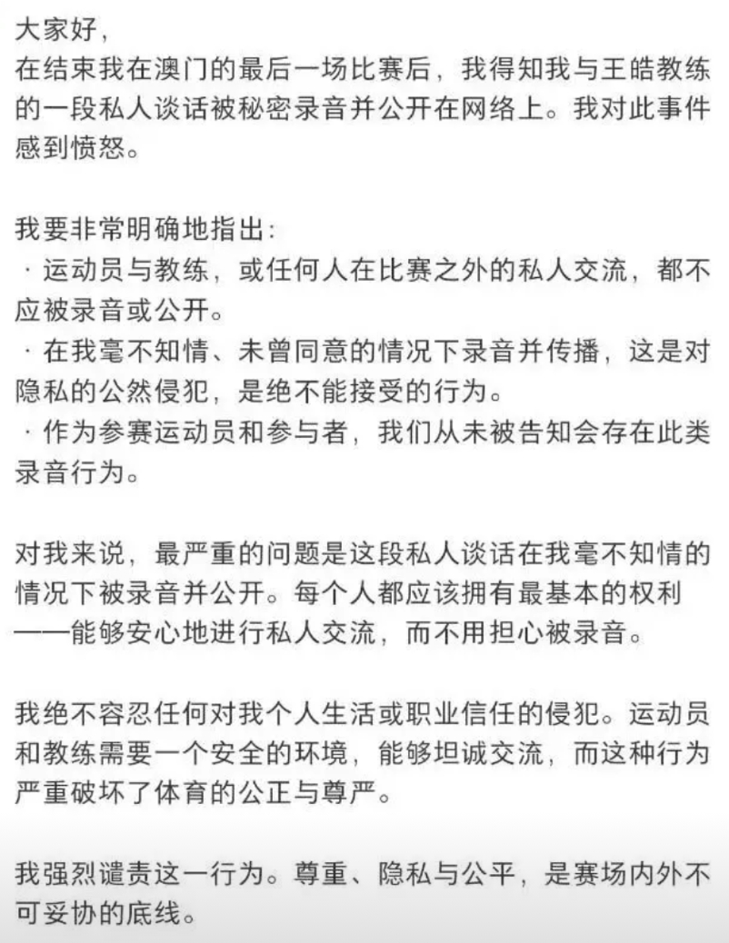 用成绩说话的竞技体育越来越像娱乐节目,像真人秀了,不尊重运动员和教练员的隐私,人与人的生活聊天都被录取发到网上,在场的工作人员还有没有职业道德和修养。 支持邱党追责,让组织方负法律责任,邱党发文他在WTT澳门冠军赛比赛结束后,他和王皓教练的私聊被人录音放到网上,他和王皓教练都不知道。 王皓教练后面还有好几场比赛,这不是故意影响他状态吗?希望组织方承办方给出说法。
