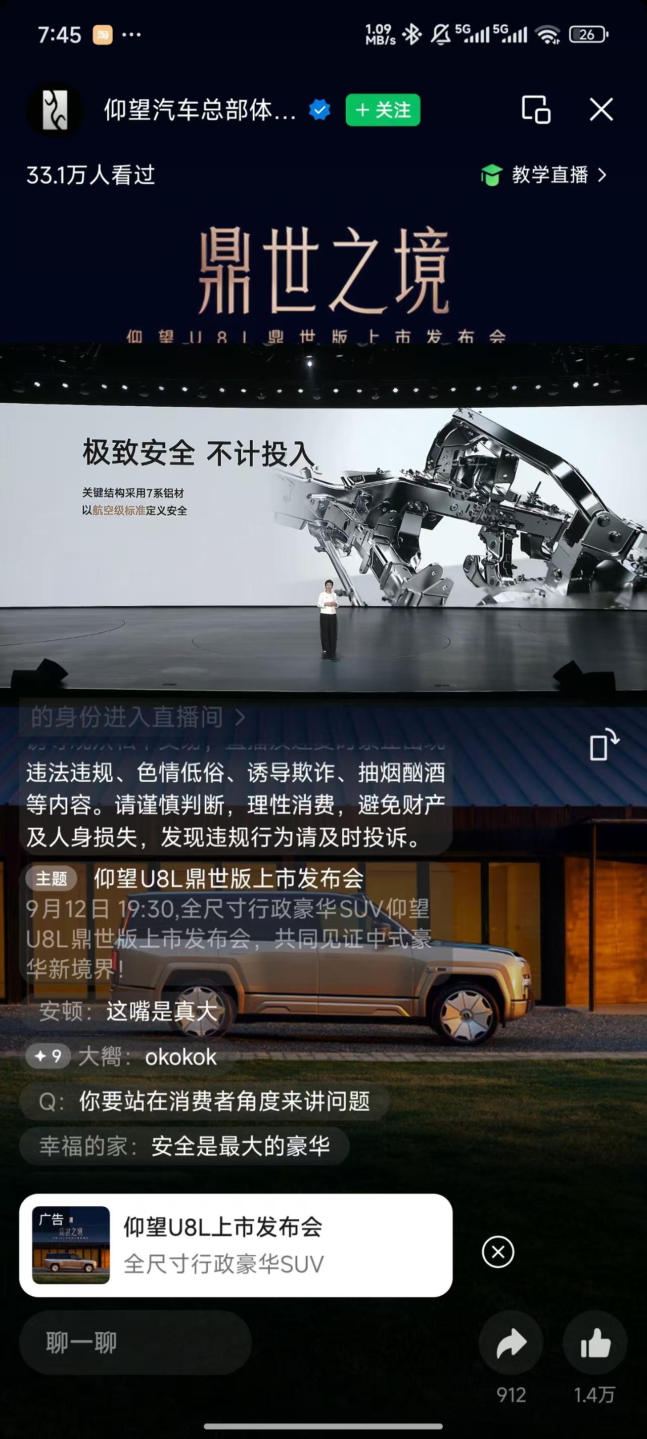 气场方面,仰望U8L确实很强,压迫感要远远超过揽胜、大G,还有点中国东方美学的韵味。 技术方面,U8L鼎世版直接到顶,集齐了比亚迪目前最强的技术,以前讲逢山开路、遇水架桥,仰望这车直接就能上山下水,越野能力确实没得说。安全性方面,这一次也是采用全铝材质,既轻便又可靠,为豪华注入鼎级安全。 大胆预测一下,这个车以后会在老板圈成为标配,有鼎世必成功。【来自懂车帝车友圈】