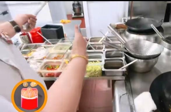 这盘小炒肉的现场,我发现了几个问题: 首先,我认为这厨师应该是正经厨师,因为他手法熟练,有基本功的。 其次,这厨师应该不经常炒菜,这场炒菜不过是现场直播所需,你看,如果一个真正的正在工作的厨师,谁会一手金链子,一手戴手表,不说不允许,自己也舍不得呀,油污很容侵蚀这些的。 再者,听说过一份菜一份菜配好放的,没听说过,蒜,煉椒生姜等等也是安份配好的。 再其次,油盐酱醋等佐料居然架在灶台和配料台之间,把过道都堵死了,这消防允许吗?