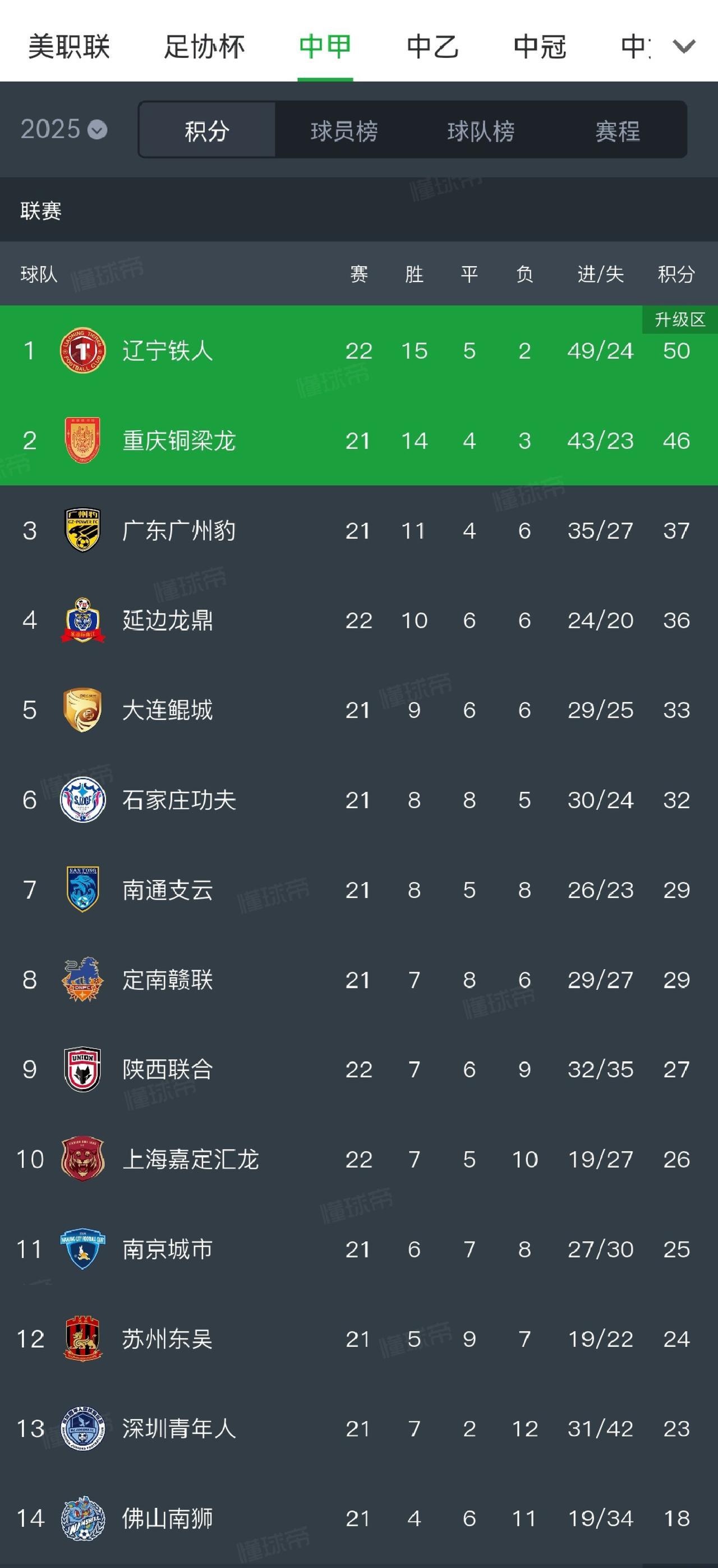 谁说今年重庆铜梁龙会踩刹车的?现在都可以争冠了!目前少赛一场只落后榜首铁人4分。 陕西联合这轮厉害啊,居然赢了中甲领头羊。铁人这场失利只能说还是太依靠这俩外援了,尤其这个邦本,他就是目前辽宁队的阵眼,没有他李金羽的战术就彻底不灵了。 现在就看明天的重庆铜梁龙能不能赢球了,要是赢了那只落后铁人1分了。 今年升超的两个名额基本就是铁人和重庆了。现在唯一的看点就是重庆能不能后来居上逆转夺冠! 明年中超可以看到东北三兄弟德比(长春,大连,辽宁)和川渝德比了。当然前提是亚泰不能降级。