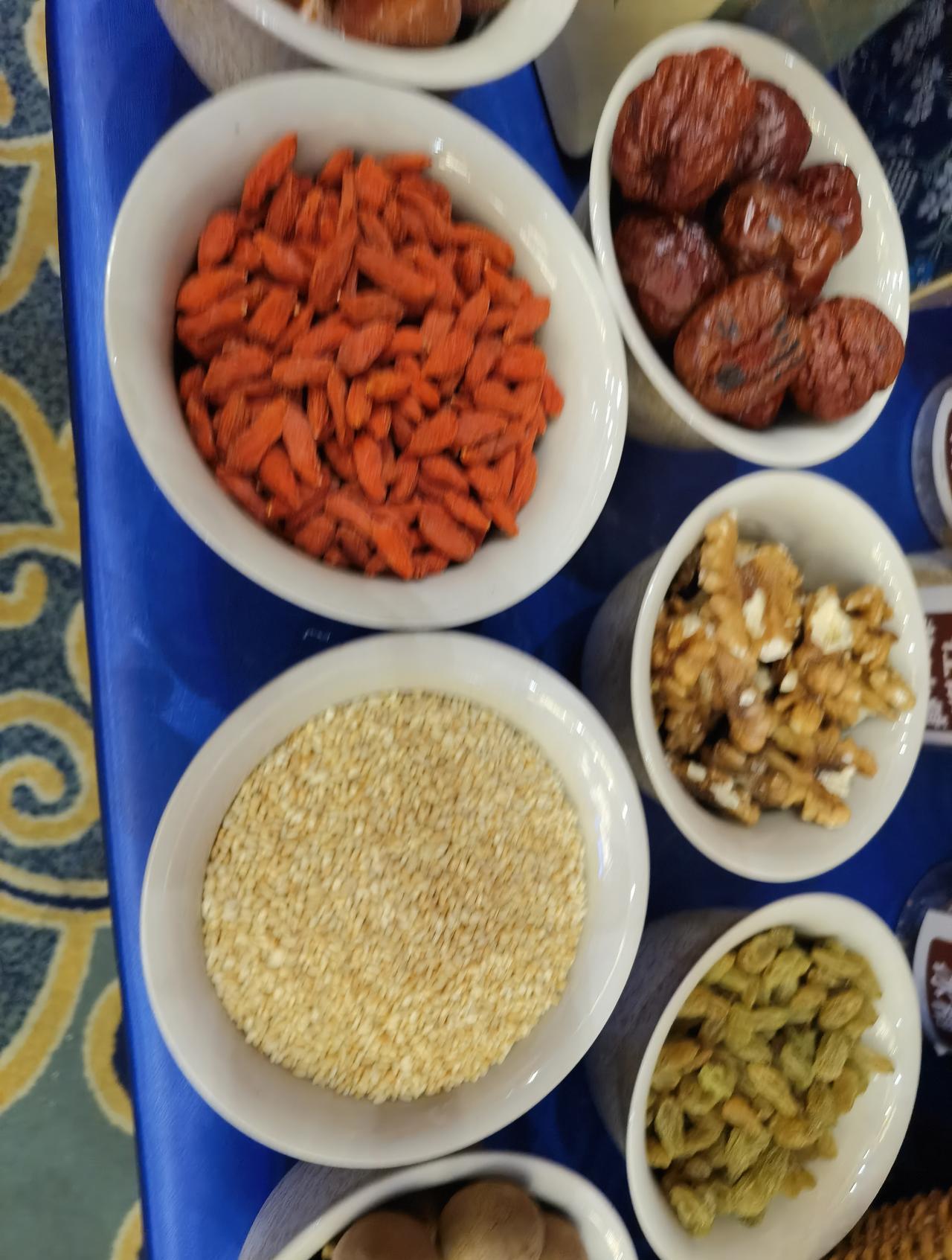 西北三泡台配料丰富得很。常见的有春尖茶(绿茶)、桂圆、枸杞、葡萄干、大枣和黄冰糖