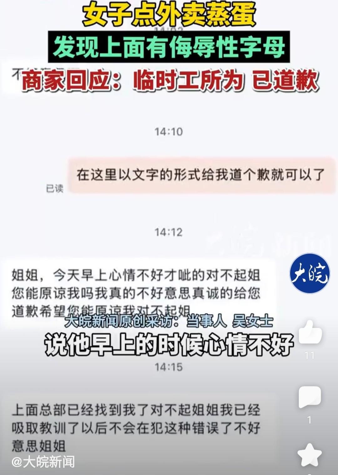 9月10日上午,家住上海的吴女士腹中饥饿难耐,挑选后点了一份小吃,收到后她迫不及待地打开,本想好好享受美食,却发现一份蒸蛋上写着字母。 吴女士很生气,一怒之下拍视频发到了网上,结果很快引起了人们的关注。 店家发现后,主动打电话给吴女士解释,说是店里一名男店员所为,当时他心情不好,所以做出这样的事情。 店家向吴女士道歉,并说总部已经注意到了这件事,店家愿意对她进行适当补偿,希望吴女士把视频删掉。 吴女士点餐原价是27.9元,用了优惠券后实际付款为11.89元。 但在这种情况下,自己对蒸蛋的安全性也有顾虑,所以她没敢吃,对店家的补偿也没接受,但考虑之后,她把视频下了架。 有人认为吴女士有点儿小题大做,这一点小事不至于把视频发到网上。 有人认为店家对顾客不够负责,态度敷衍,直到影响扩大引发众人关注才正面回应。 还有人认为是该店管理不到位,以致于下面的分店对员工要求不够严格。 那么,从法律的角度来讲,应该如何进行评判呢? 吴女士给店家打电话,店家没做任何解释,她一气之下把视频发到网上,这种行为是否得当呢? 根据《消费者权益保护法》第十五条规定:消费者享有对商品和服务以及保护消费者权益工作进行监督的权利。消费者有权检举、控告侵害消费者权益的行为。消费者可以通过网络平台上传视频,真实反映消费过程中的问题。 吴女士在没有得到店家答复的情况下,选择上传视频,这是一种正当的维权行为。 难道因为自己情绪不好,就可以把不满发泄到顾客身上吗? 根据《食品安全法》第三十四条规定:禁止生产经营污秽不洁、混有异物的食品。 蒸蛋上的字母是店员在闹情绪时故意添加,属于异物,所以该店员的行为不仅违反了道德,而且违反了《食品安全法》。 而且这种行为可能影响食品安全,吴女士出于安全考虑拒绝食用是非常合理的。 该店员因为泄愤,在顾客的蒸蛋上添加字母的行为属于私人行为,店家需不需要担责呢? 店家作为雇主,未尽到管理职责管理好员工,致使员工做出不当行为,店家需承担替代责任。 当然,因为这是该店员故意做的,所以店家可以追究该员工的责任。比如说对他进行罚款或直接解雇。 后来,事情闹大后,引起了总部的关注,那么总部需不需要担责呢? 尽管目前还没有明确、直接的法律条款证明总部需要承担责任,但2025年市场监管总局连续两次发布了关于餐饮服务和食品销售连锁企业落实食品安全主体责任的征求意见稿,里面特别强调了总部对分店负有管理责任,总部对下属分店人员要培训与考核。 该店员的心里素质和道德素质明显不高,虽然他当时心情不好可以理解,但不应该把不良情绪发泄到无辜的顾客身上,总部对员工的道德素养和专业素养培训不到位。 看似该店员一个只是小小的举动,最终却害人害己,连累了很多无辜的人。 对此,您怎么看,欢迎评论区留言交流。