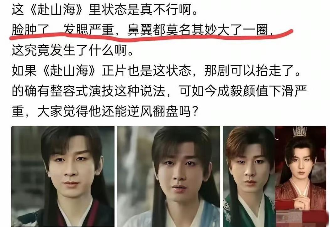 千呼万唤的《赴山海》终于抬上来了,看了两集忍不住感叹:还不如当初埋了呢! 《赴山海》到底有多难看?这么说吧,一部剧碎了成毅的顶流滤镜,也打碎了他以往积累的人气和口碑!这部剧可能本意是想复刻《莲花楼》的成功,但是显然失败了! 《赴山海》不仅特 效粗糙、服化道拉胯、滤镜失真、打戏慢动作多、剧情拖沓,而且主演成毅台词太差,状态疲惫,加上皱眉歪嘴的模式化演技,被某瓣评为“2025年最难看的剧”,被薯人赐“山海关”,因为太烂把长剧的大门给关了! 不仅路 人看不下去,成毅的不少粉丝也吐槽不断,还有因此脱粉的!所以,一部剧如果连自家粉丝都不买账,只能说确实烂到家了! 成毅的古装造型也是十年如一日,和他第 一部爆剧琉璃时期没啥区别,还有十年如一日的张不开嘴的台词,依然含糊不清。可是脸部状态没有十年如一日,已明显有疲态。奉劝成毅别在古偶里打转了,趁着还有点流量赶紧转型吧! #你看成毅新剧《赴山海》了吗# #《赴山海》能复刻《莲花楼》的辉煌吗# #《赴山海》首播口碑#