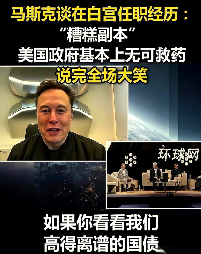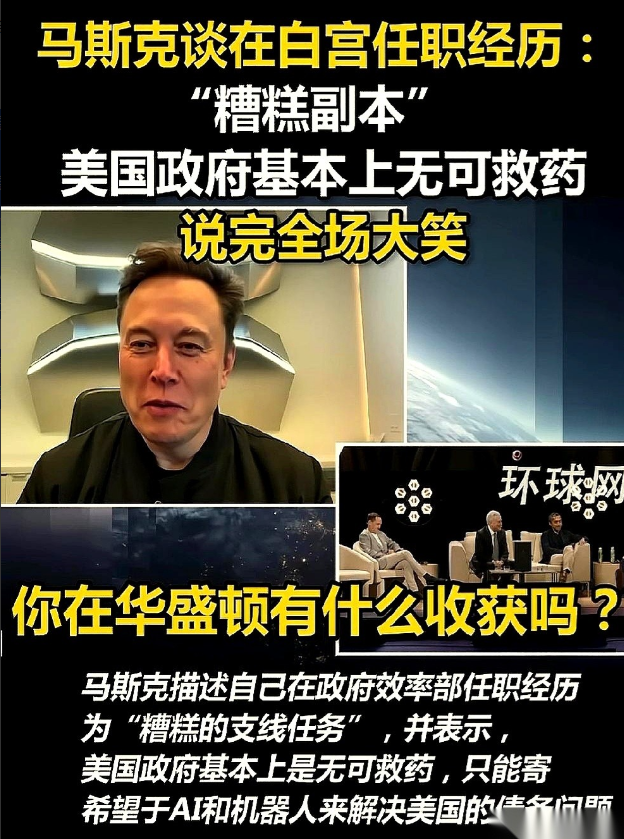 台下,哄堂大笑。 就因为马斯克说了句大实话。 记者问他在华盛顿混得咋样,他连个磕绊都不打,直接一句:“美国政府基本上……没救了。” 你品品这个笑声。 这不是在笑一个段子,这是在笑一句戳破了窗户纸的真话。 那种“哎呀我早就想说了,可算有人替我说了”的集体共鸣,懂吗? 说白了,马斯克这人,就是个工程师脑子。 他看一个系统,代码冗余,bug一堆,运行效率低到发指,他不会跟你绕弯子,说什么“有待优化”,他只会直截了当地告诉你:“这玩意儿得重写,或者干脆扔了。” 所以当他说要靠AI和机器人来解决债务问题时,我一点也不意外。 在他的世界里,所有复杂的人性问题、政治博弈,最后都能简化成一个技术问题。 虽然听着有点天方夜谭。 但那一刻,看着他云淡风轻地说出那句“没救了”,真的,有点解气。 好像堵在心口的一口气,跟着全场的笑声,一起吐了出来。