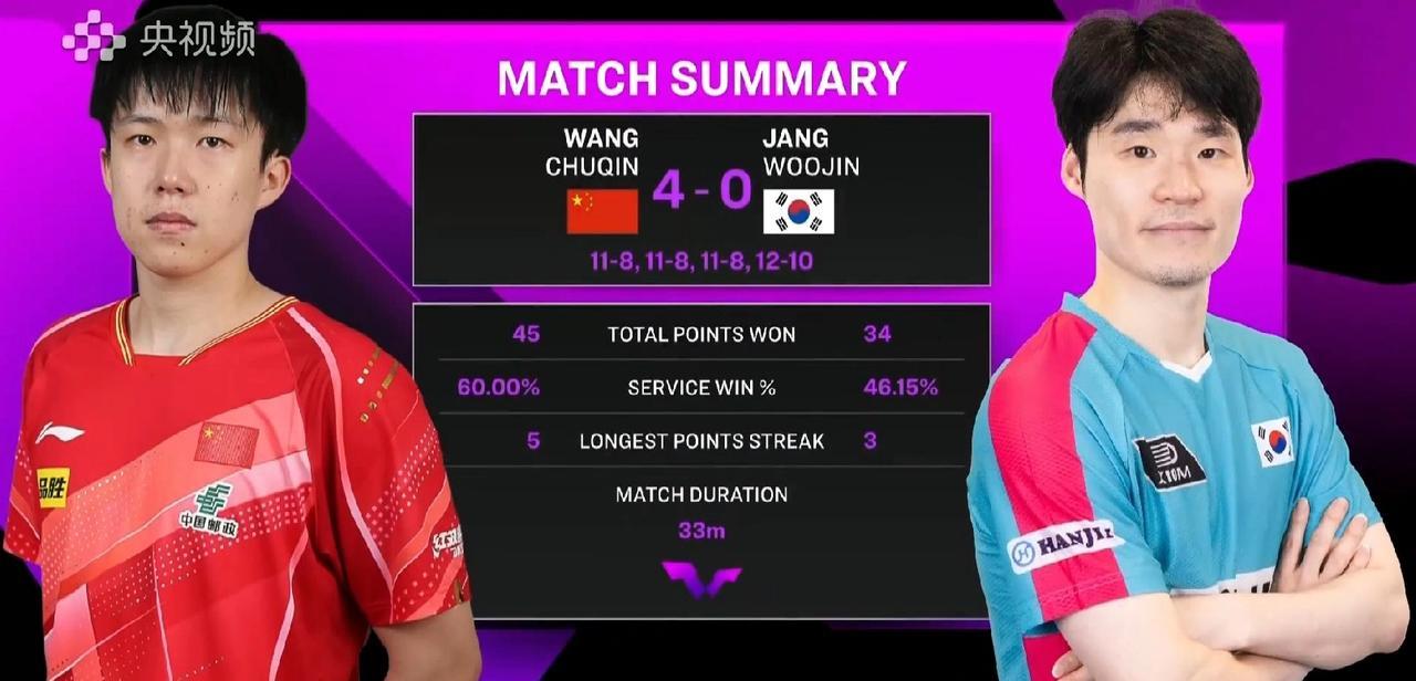 澳门冠军赛半决赛果 孙颖莎 4-1 蒯曼 王曼昱 4-2 陈幸同 王楚钦 4-0 张禹珍 决赛加油啊!健康完赛![加油] 楚钦打张禹珍,前三局都是11比8,我还怕他后面第四局也来个11比8,结果爆分了! 楚钦说跟张禹珍打,他们俩之间都很熟悉,所以他投入了100%的专注度来打这场比赛!很重视对手! 在第三局的时候,楚钦打上头了,在局尾的时候丢了一个球,都爆~了,哈哈!王皓教练赶紧给叫了个暂停,然后回来就赢了! 等待林德和雨果的结果,看看晚上的决赛对阵谁!! 莎莎,楚钦继续加油,健康完赛![加油][加油]