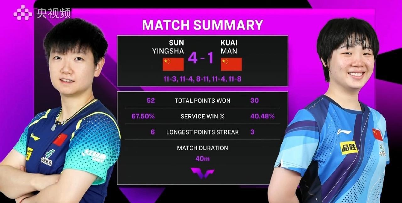 澳门冠军赛半决赛果 孙颖莎4-1蒯曼 王曼昱4-2陈幸同 王楚钦4-0