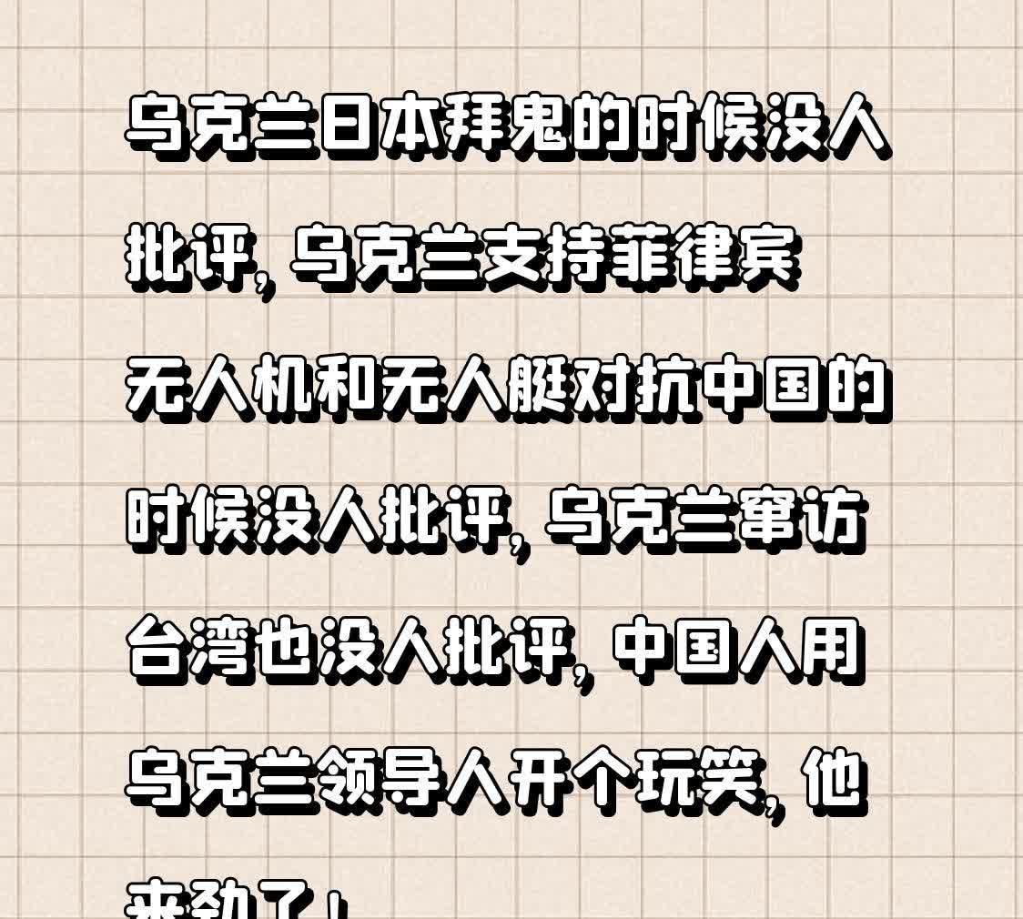 乌克兰日本拜鬼的时候没人批评,乌克兰支持菲律宾无人机和无人艇对抗中国的时候没人批评,乌克兰窜访台湾也没人批评,中国人用乌克兰领导人开个玩笑,他来劲了!