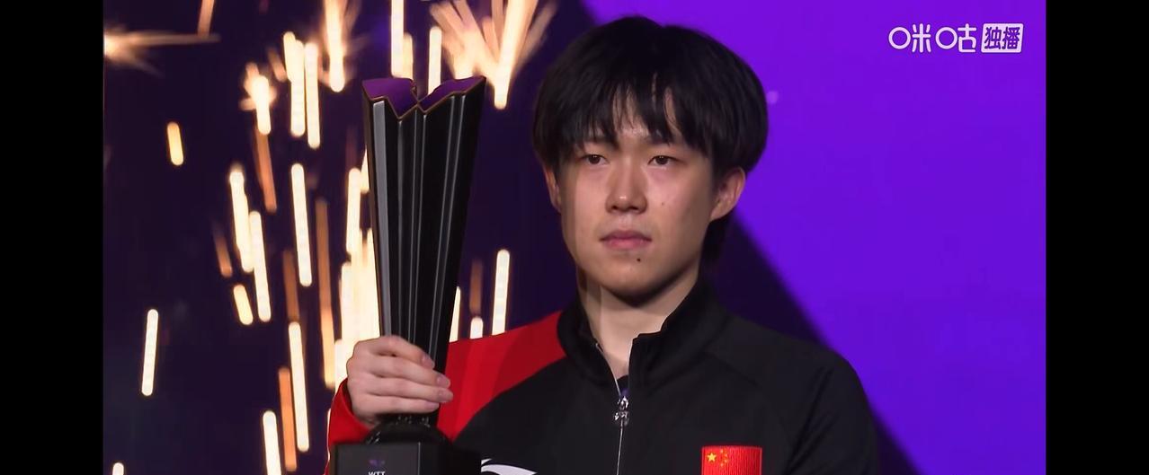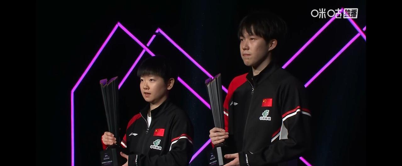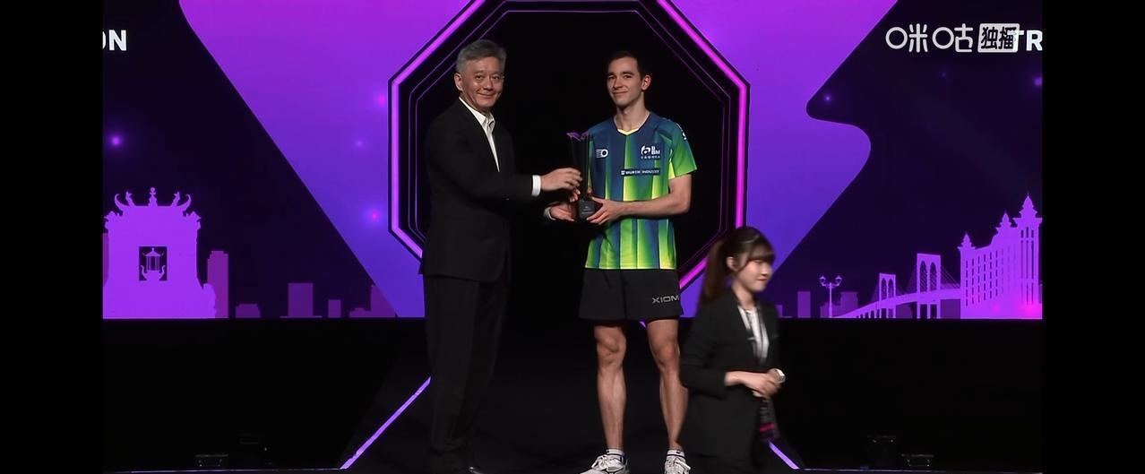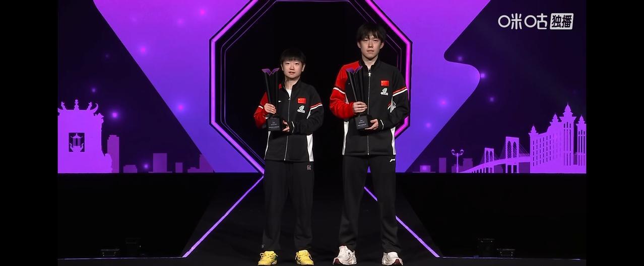 澳门冠军赛男单颁奖仪式。 冠军,中国队王楚钦,亚军,巴西队雨果。 与女单冠军合照