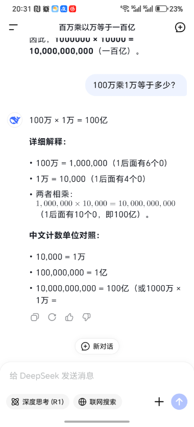 今天看到一个新闻,卖100万的尊界S800,因为交付量不足,还欠用户1万台,董事长和员工都去工厂打螺丝去了。突然就好奇,100万个1万有多少营收?于是用豆包和deep seek分别算了一下,答案居然迥然不同。看来豆包的运算能力还是要加强一下,毕竟江淮无论如何也挣不到10000亿