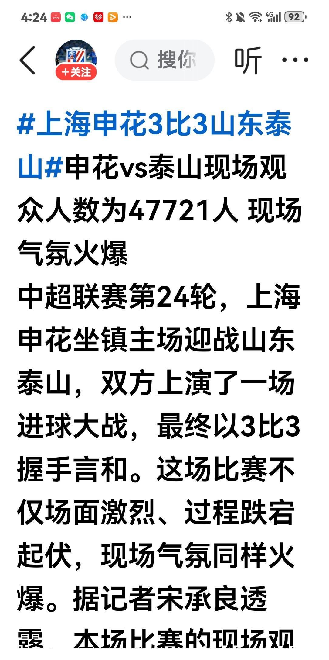 十万球迷亲历输与平 人多悲人少喜反差特悬殊 8月9日的德比之战,现场有六万人观赛。据悉,申花球迷达五万五千人,海港球迷仅五千人。申花球迷占据绝对上风,然而,人多势众的他们却目睹球队1比2落败。全场寂静无声,球迷们掩面痛哭;而人数较少的海港球迷,却见证球队2比1获胜,得意而归。 9月12日,申花在主场迎战老朋友泰山队,到场观赛的球迷多达四万七千七百二十一人。申花球迷本以为稳拿三分,比赛进程却是申花先取得进球,随后被扳平,接着反超又被扳平,最后再次反超,3比2领先。只要撑过最后时刻,全场定会欢呼雀跃。然而,令人难以置信的是,门将犯下极为低级的错误,让泰山队的瓦科完成帽子戏法。数千泰山球迷见证了绝平瞬间,而四万多申花球迷难以接受这一平局,群情激奋,指责斯卢茨基,痛斥球队和守门员。 主宰球场局势的是教练的排兵布阵和球员的球技,并非球迷数量能左右胜负。 不如意寻常事,呜乎哀戓!