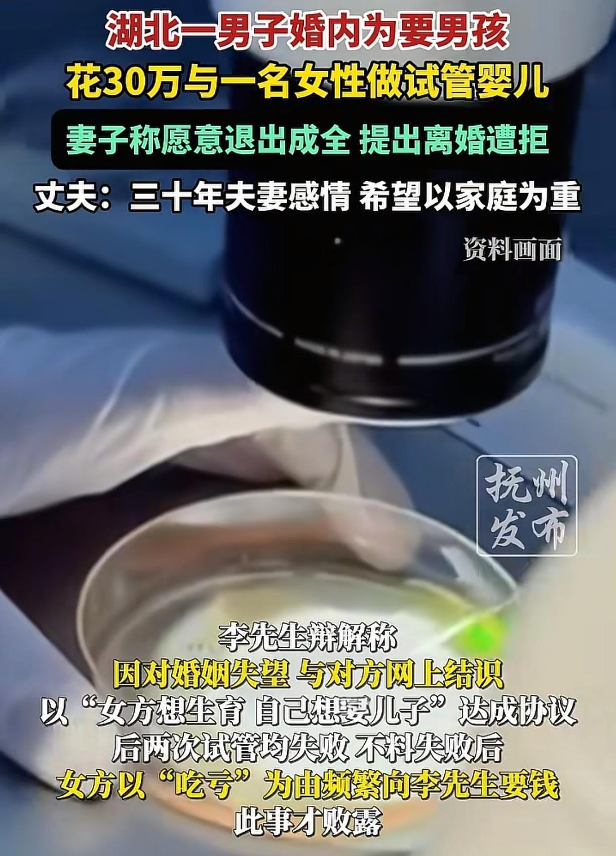 湖北,男子一直都想生一个儿子,可他和妻子结婚30年,都未能如愿,他遇到一个女子,两人一拍即合,做了两次试管,花了30多万,结果都失败了。女子觉得自己吃亏了,屡次问他要钱,事情败露,男人妻子气坏了,提出如果两人是真爱,她愿意离婚,成全两人,可男子的决定,让人有些看不懂。 王女士和李先生曾经是同事,王女士性格内向,平时总是安安静静的,可李先生性格开朗,走到哪里都是一片欢声笑语。 正是因为性格上的互补,两人在相处中渐生情愫,最终走到了一起。 婚后,夫妻二人开了一家餐馆,在两人的共同经营下,餐馆的生意一直都不错,一家人的日子过得红红火火的。 虽然两人衣食无忧,但是夫妻之间的小矛盾却不断,也许是未能生育一个男孩,李先生经常因为小事对王女士进行责怪辱骂,王女士既要帮着丈夫经营餐馆,又要照顾孩子和打理家里的一切大小事。 她原本想着,只要自己做到位了,那这个家就守住了。 可让她始料未及的是,2023年5月,她像往常一样在餐馆忙碌,却发现丈夫总是背着自己出去接听电话。 看过丈夫的手机后,她整个人都懵了,丈夫一向节俭,但是他却背着自己,花了30多万,和一名女子去做了2次试管婴儿。 王女士的手颤抖着,眼泪止不住地流,她怎么也想不明白,自己为这个家付出了这么多,丈夫怎么能做出这样的事情来? 她怒气冲冲地找到丈夫,质问他为何要这样做? 面对妻子的质问,李先生却解释说自己对这段婚姻失望透顶了。 闲来无事,他在网上聊天时,遇到了一名女子,对方想要生个孩子,自己又特别想要一个男孩,两人一拍即合,达成了协议,去做试管婴儿。 王女士听着丈夫的话,气愤难平,丈夫竟然如此轻易地就背叛了他们的婚姻,还把责任推得一干二净。 她强忍着心中的悲痛,表示既然丈夫觉得家庭生活不幸福,如果他和对方是真爱,她愿意离婚退出,成全两人。 李先生听到妻子要离婚,也慌了神,百般恳请,说自己会以家庭为重,说什么都不肯离婚。 王女士看着眼前这个曾经深爱的男人,此刻如此狼狈的恳请自己,心里五味杂陈,她不知道该不该相信他的话,这么多年的感情,不是说放下就能放下的。 可丈夫的背叛,让她陷入了深深的痛苦和挣扎之中。 目前,她尚未决定是否原谅丈夫、维系这段婚姻。 《民法典》第1043条规定:夫妻应当互相忠实,互相尊重,互相关爱。 夫妻之间有相互忠诚的义务,李先生背着妻子,和一女子进行试管婴儿的行为,严重违背了夫妻忠实的义务,也伤害了夫妻感情,这种行为既不道德,也违背了公序良俗。 李先生为了做试管婴儿,花费了30多万元,这笔钱属于夫妻共同财产。 夫妻对共同财产享有平等的处理权,在处理共同财产时,应当协商一致。 李先生在没有与王女士商量的情况下,擅自将大量夫妻共同财产用于与家庭共同生活无关的事项,如王女士起诉离婚,是可以要求对方进行合理的补偿的。 《民法典》第1092条规定:夫妻一方隐藏、转移、变卖、毁损、挥霍夫妻共同财产,或者伪造夫妻共同债务企图侵占另一方财产的,在离婚分割夫妻共同财产时,对该方可以少分或者不分。 如李先生将夫妻共同财产进行挥霍等,王女士如果提出离婚,是可以要求对方少分或者不分夫妻共同财产的。 如夫妻一方婚后出现严重伤害夫妻感情,并导致婚姻破裂的,另一方可以起诉离婚,并要求给予精神损害赔偿。 《民法典》第1091条规定,以下情形属于法定过错,无过错方可以在离婚时要求损害赔偿:重婚;与他人同居;实施家庭暴力;虐待、遗弃家庭成员;有其他重大过错。 李先生跟他人试管,属于有其他重大过错的行为,如王女士起诉离婚,是可以要求其给予精神损害赔偿的。 夫妻之间需要相互理解,相互关爱,当婚姻出现问题,应当跟对方好好沟通,开诚布公的去谈一谈,而不是采取背叛或者伤害对方的行为。 若存在代孕行为,则可能构成违法,需承担法律责任。 信源:抚州发布 2025年9月15日 关注@律觀法说 ,从法律角度看世界,感受不一样的人情冷暖。