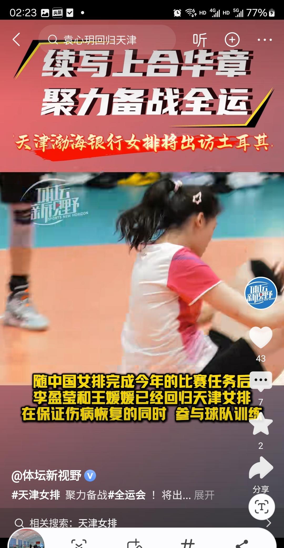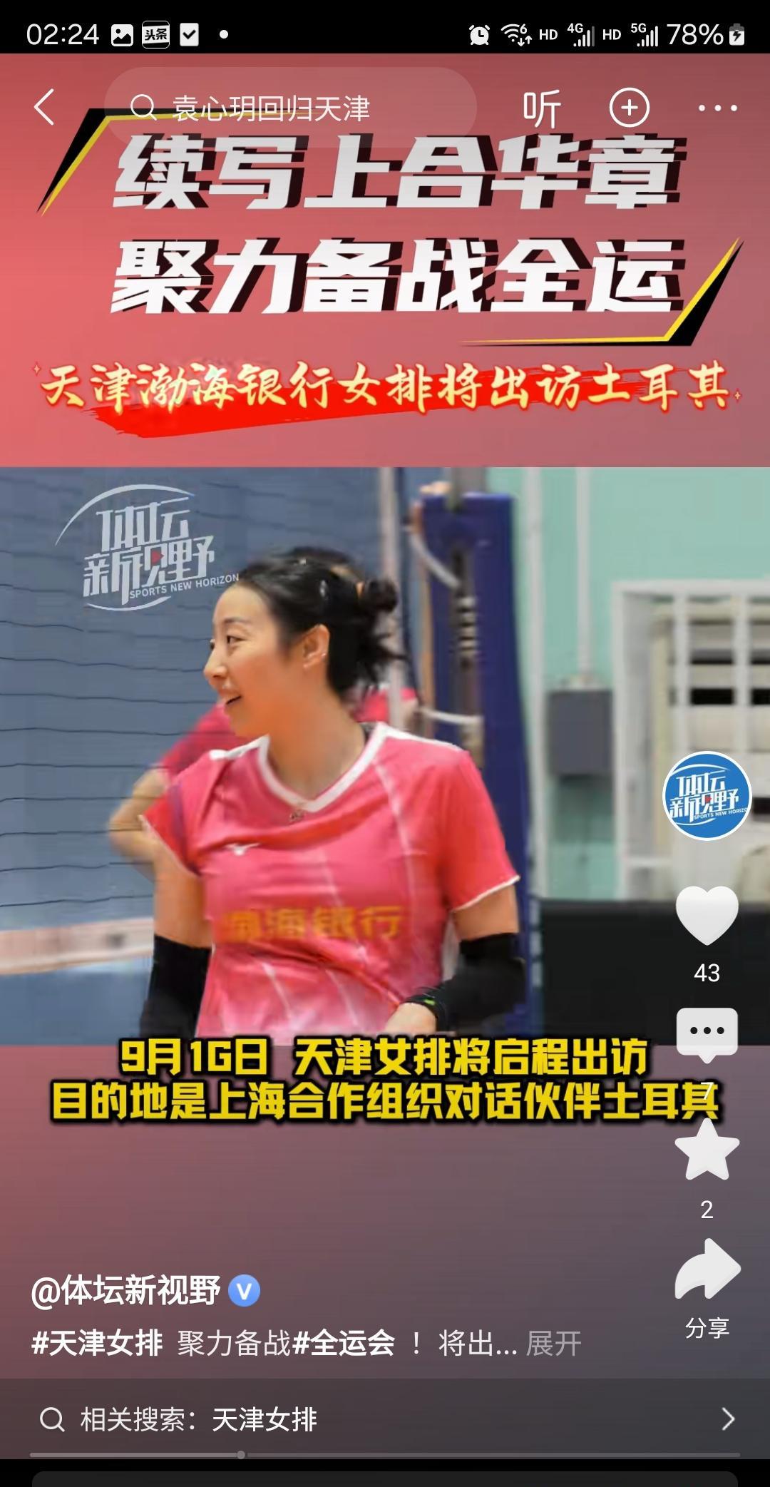 据体坛新视野报道,天津女排阵容齐整备战全运会,李盈莹、姚迪、袁心玥、王媛媛四名绝