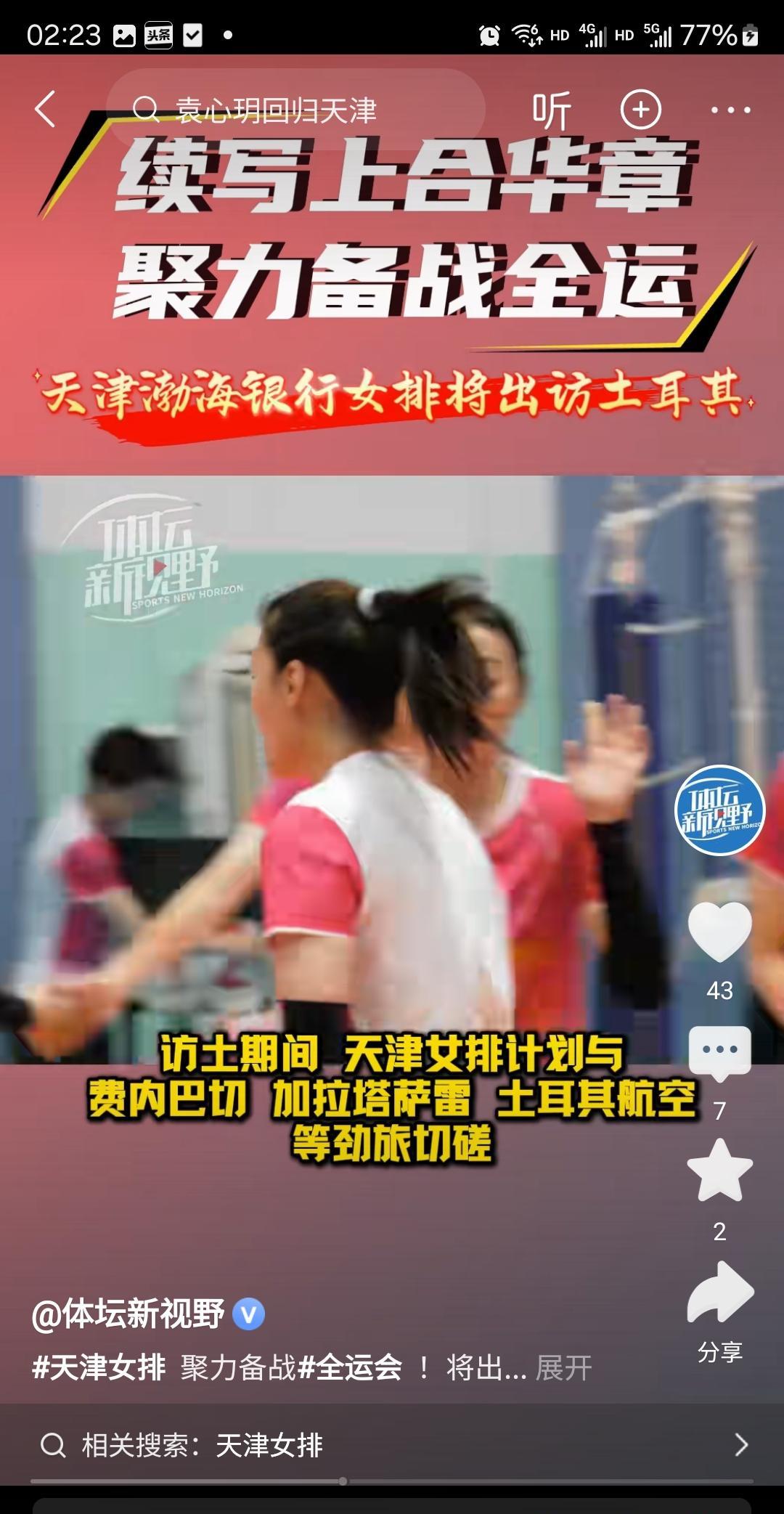 据体坛新视野报道,天津女排阵容齐整备战全运会,李盈莹、姚迪、袁心玥、王媛媛四名绝对主力已随队训练,全队将于今日出发出访土耳其,其间将与费内巴切、加拉塔萨雷、土耳其航空等四支劲旅切磋。主教练陈方在接受采访时说:“这次我们全运会之前正式的一次训练对抗比赛的一个机会,尤其是跟土耳其的四支强队来打,所以我希望我们队伍能通过对土耳其这种高水平的对抗,能做到以赛代练,把我们的技战术能配合得更好。”