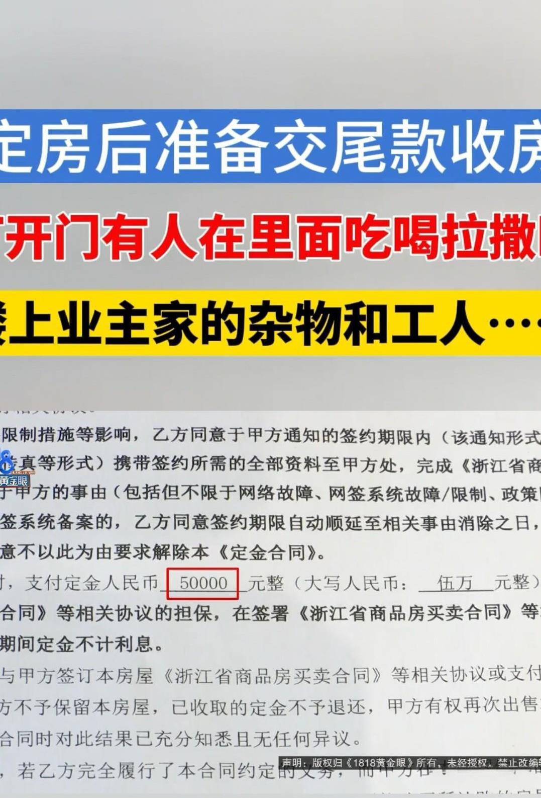 浙江金华,女子买的新房被别人占用了。她花5万定下了1套145万的88平米的房子,由于对方多次延期交付,她就没有交尾款。直到可以收房的时候,她发现房间里有人撒过尿,气味很大,窗台上还有一条裤子,房间里也堆满了杂物。她要求要么换房,要么退房,工作人员则表示,女子还没交尾款,按道理说还轮不到他来向我们讨要说法 1818黄金眼9月15日报道,余女士在去年9月的时候看上了1套房子,面积是88平方,总价145万。 当时她交了5万的定金,本想依次把尾款交齐,但到了交付的时候,交房时间延期了几次,她就有点担心,决定还是等正式交付的时候再交尾款。 房产公司也没有催她,到9月8日的时候,房产公司通知她可以收房了,这时她才准备拿着钱来一次性付清。 可是一开门,里面放了很多东西,余女士还以为走错了。再三核实后,发现确实是自己的房子。 里面除了床板,还有吃的、用的,窗台上居然还有一条裤子,阳台上的尿味也很大,熏得余女士都不敢收房。 她问工作人员:“这到底是谁的东西呀?我都还没入住呢,就有人这么大大方方把杂物堆在我的房间里?” 她先是想搞清楚到底怎么回事,之后便决定不要这房子了,因为还没有入住就有尿味,这让她产生了很大的心理阴影。 后来,4楼的女业主才发来信息,说当时自己在国外,就找了搬家公司搬东西,结果搬错了,把东西放在了3楼(余女士的房子)。 并且她还透露,朋友发来了商品房停止销售的公告,而她楼下余女士的房子也在公告名单当中,所以知道放错后也没有立即处理。 4楼女业主买的是4楼的二手房,想装修好后出租,当时搬家公司的工作人员觉得干活途中不方便,中午就跑到3楼去休息。 这个过程倒是说得通,但房门是怎么打开的?4楼女业主说得含糊不清,只说是工作人员告诉她的,但她脸盲,不知道是哪一个工作人员。 后来联系上了搬家公司的师傅,他也老实地说,当时他们干活全身都是灰尘,又有点热,所以就在阳台那里用水冲了一下身体,还换了一下裤子,把裤子放在了窗台,之后忘记拿了。 对于余女士家中的尿味,搬家公司师傅却不承认,说绝对没有在那里上过厕所,只是借用那里的房间休息了一下。 问到为什么知道房门密码时,搬家公司师傅说是4楼男业主告诉他们的,可4楼男业主又是怎么知道密码的?这个问题没有得到回复。 事情基本理清了,余女士也不好奇这中间的细节了,她现在唯一的要求就是换房,自己不会再要这套房子;另外,要么房产公司退钱,她自己找另外的公司买房。 工作人员则表示,余女士还没有交尾款,按道理说,这房子还不属于她,也还轮不到她向公司讨要说法。 不过,至于4楼业主让人把东西放在余女士的房子里,给余女士收房造成了困扰,他们会去找4楼业主协商解决。 当时余女士找来了协调人员上门,工作人员却含糊其辞地说:“你要是这样的话,我就只能用官方用语了。” 余女士没听懂,疑惑地看着他,工作人员接着说:“我建议还是私了。”但具体怎么私了,他没有说明。 那么,余女士该如何维权呢? 一、余女士与房产公司的买卖合同关系:余女士交了五万定金,就和房产公司形成买卖合同,公司是否应尽到管理义务,使房屋处于可交付状态? 依据《民法典》第五百八十六条,“当事人可以约定一方向对方给付定金作为债权的担保。定金合同自实际交付定金时成立。” 定金的交付已明确双方交易权利义务,余女士享有合同项下的房屋期待权,房产公司则需履行对应义务。 根据《民法典》第五百六十三条规定,“当事人一方迟延履行债务或者有其他违约行为致使不能实现合同目的的,当事人可以解除合同。” 余女士可以和公司解除买卖合同,要求他们退房或者换房。 《民法典》第二百三十五条,“无权占有不动产或者动产的,权利人可以请求返还原物。” 余女士基于合法买卖合同,对案涉房屋享有排他的占有期待权,4楼业主的“无权占用”行为直接侵害了这一权利,余女士有权要求其立即腾退房屋、移除杂物。 对于余女士的这件事,大家如何看待的呢?文中人物均为化名。
