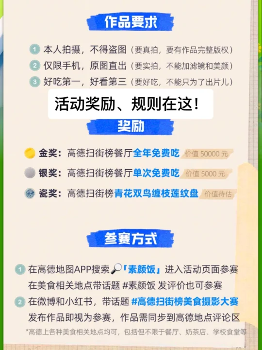 3,/某博发美食作品也行,只要带话题 高德扫街榜美食摄影大赛 并同步到高德地点评论区就可以啦~