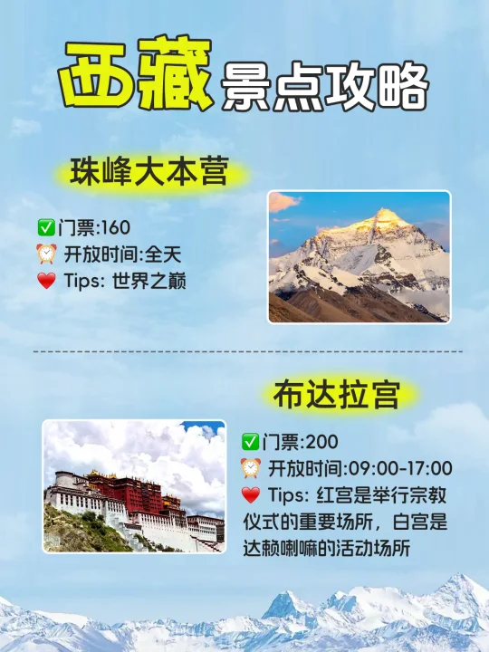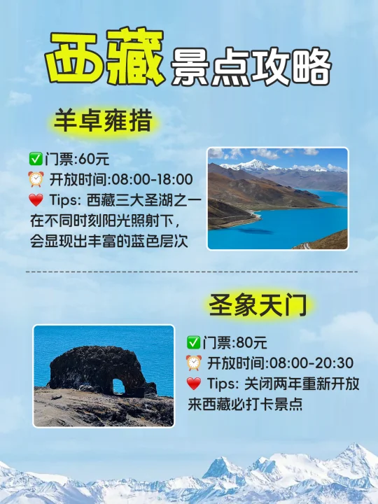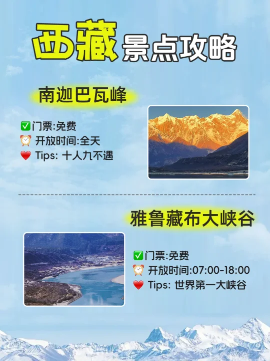 📸打卡景点:雅鲁藏布大峡谷、南迦巴瓦峰、索松村、贡德林草原、达谷峡谷、羊卓雍错、卡若拉冰川、崇巴雍措、嘉措拉山口、珠峰大本营、尼木草原、念青唐古拉山、那根拉山口、圣象天门、藏北草原