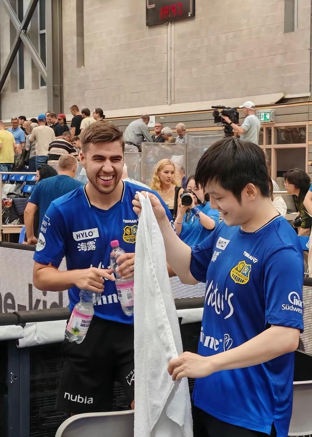 樊振东德国打球的环境,场地不大,不华丽,貌似也不是专门的乒乓球场地,看球的人中黑头发黄皮肤的不少,显然很多当地的华人来支持东子了,很多大龄老外在现场都坐在前排,非常认真地看比赛,可能乒乓球是上一代人活动的一个重要部分,年轻人或者上网,或者打游戏,可能其他形式的活动更多。 东哥的队友对于有东哥这样的队友很开心,笑成了一朵花。