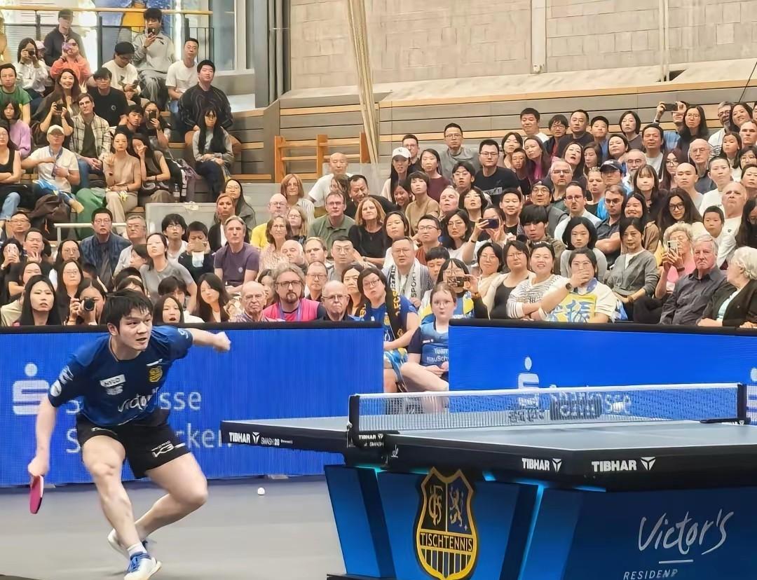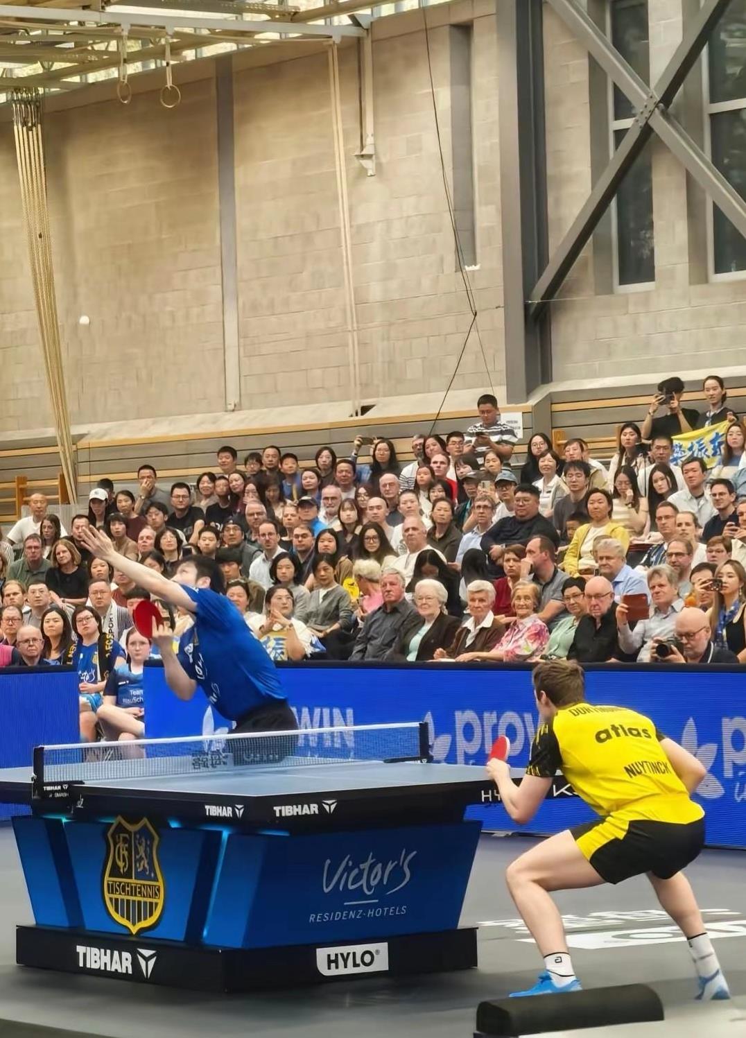 樊振东德国打球的环境,场地不大,不华丽,貌似也不是专门的乒乓球场地,看球的人中黑