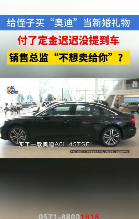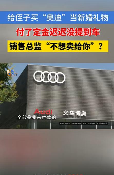 浙江金华,一男子不差钱,他侄子要结婚,男子为了给侄子撑面子,决定花344939元,给侄子买一辆奥迪A6,给侄子当新婚礼物,他交了5000定金,可半个月都没提到车,万万没想到,销售总监却说:我卖其他人30万我也卖,我心情不好,就不想卖给你!而4S店违约的真正原因惊呆众人。 (信息来源:1818黄金眼 2025年9月9日) 王先生(化名)的侄子从小就跟着爷爷奶奶一起生生活,所以王先生看到这样的情况很是心疼自己侄子,所以在侄子还小的时候就经常会给他买很多好吃以及衣服。 然而近日王先生看侄子马上就要成家了,于是就见着送给侄子一辆汽车给他接接喜气,随后他就和老婆一起去了4S店到那之后两人觉得一辆奥迪系列的汽车很适合。 随后便找了销售总监问了价钱之后,销售说目前这一款车是最低价只需要三十四万多,王先生一听立马就说这辆车他要了,双方签订协议之后,王先生付了五千块钱回家等着交车。 不料已经过了二十多天了,眼看就要到侄子结婚的时候了,还是没有收到让去取车的消息,随后王先生就来到了店里面询问一下是怎么回事,谁知销售管理人员说,自己心情不好所以不想把这辆车卖给他了。 听到这之后我那个先生没有给他们废话直接叫了记者来帮助推进这件事情,后经过记者的了解,发现这家店之所以这么说是因为他们卖给王先生的价钱比市场价低了差不多两万元。 所以他们这是想毁约,王先生觉得自己既然交了定金那么商家就一定得按规矩办事,不然要是执意违约的话就要按照约定双倍赔付。 随后记者看到协议中虽然没有明确规定交车时间,但是规定了要有一方违约便需要双倍赔偿,这时候记者就来到了这家4S店,但当天正好是那名销售人员休息。 目前那名工作人员还没有发表任何声明,记者称后续如果还这样的话就会直接这家店的老板处理这件事情。 希望这件事情能够快点解决掉,不要影响侄子的婚事,那么对于这件事情你还有什么要说的吗?