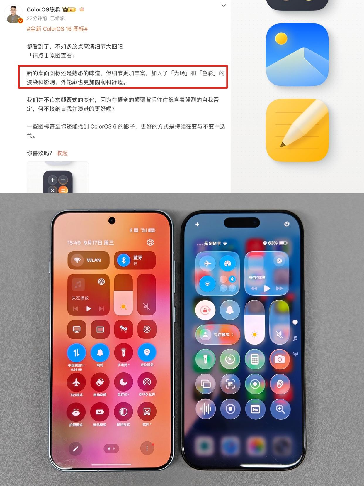 升级iOS26的后遗症,还是需要个安卓搭子 iOS26正式版推送了,大家都升级了没有?😂看网上不少人都说升级之后天塌了,新UI适应不过来,还好我忍了一手。 我反正作为老双持用户,iPhone和安卓都有,对比看看,大家觉得苹果这液态玻璃好不好看? 不得不说,OPPO审美还是有点东西的,OPPO陈希还放出了ColorOS 16的新图标设计,看起来更精致了。 而且现在就算是要用苹果全家桶,用安卓也行啊,像OPPO的ColorOS 16,都快成原生苹果搭子了,据说是会成为原生苹果全家通,耳机、手表、电脑都能互联互通。 我特别看了下,OPPO陈希发的ColorOS 16跟Mac的互联新功能,能多开手机应用,手机通知也能直接流转到电脑上,功能是一点不差,这不是妥妥完美兼容了?甚至我觉得比苹果更好用有木有? 现在苹果的生态也没有那么独立了,国产品牌一个个的都想着打通,找个安卓搭子还挺有性价比的,就是不知道这ColorOS 16什么时候更新,我的Find X8s已经饥渴难耐了。