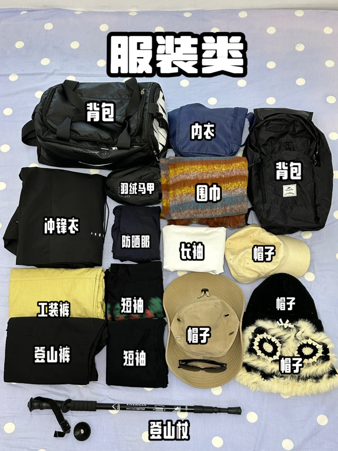 双肩包建议买一个轻便防水的登山包!雨具要带!