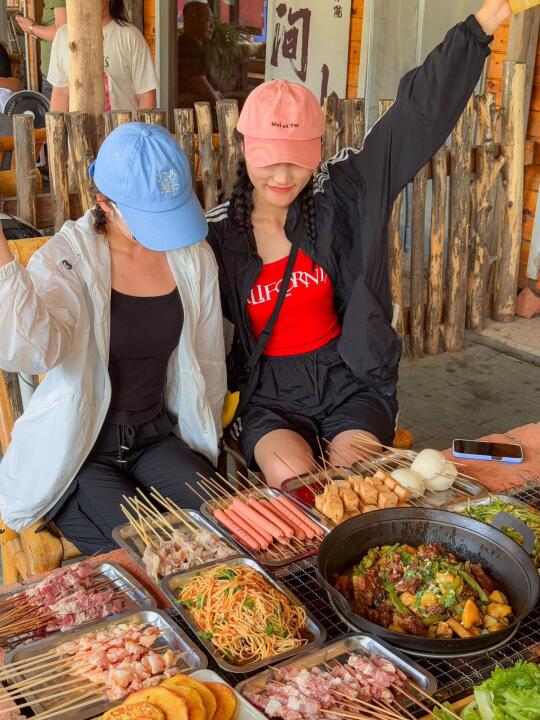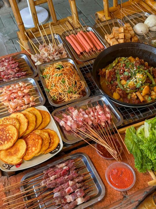 漂流完直接去山脚的营地,烧烤、铁锅炖安排上!食材新鲜,味道超赞,坐在青山绿水间吃饭,简直不要太惬意~