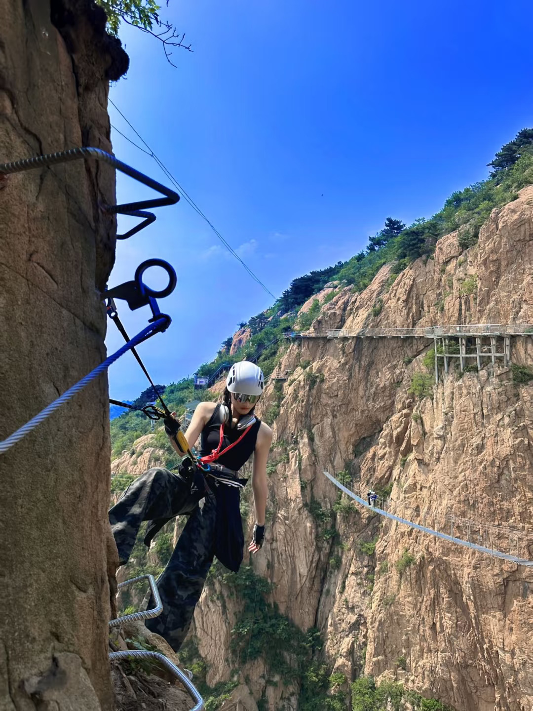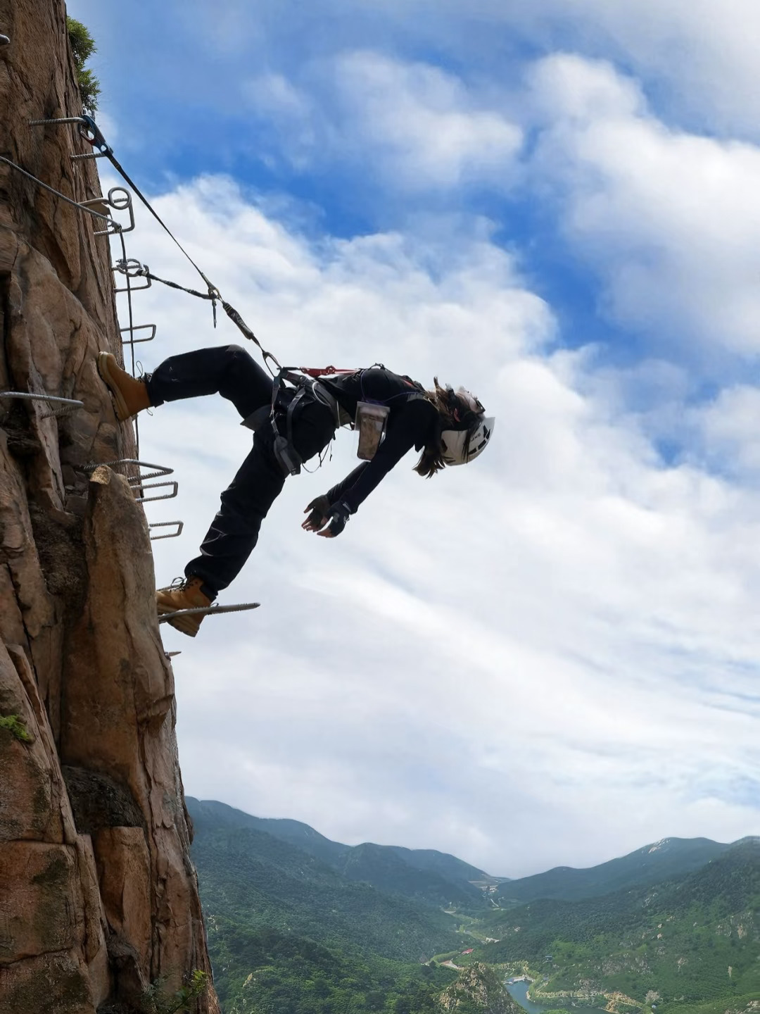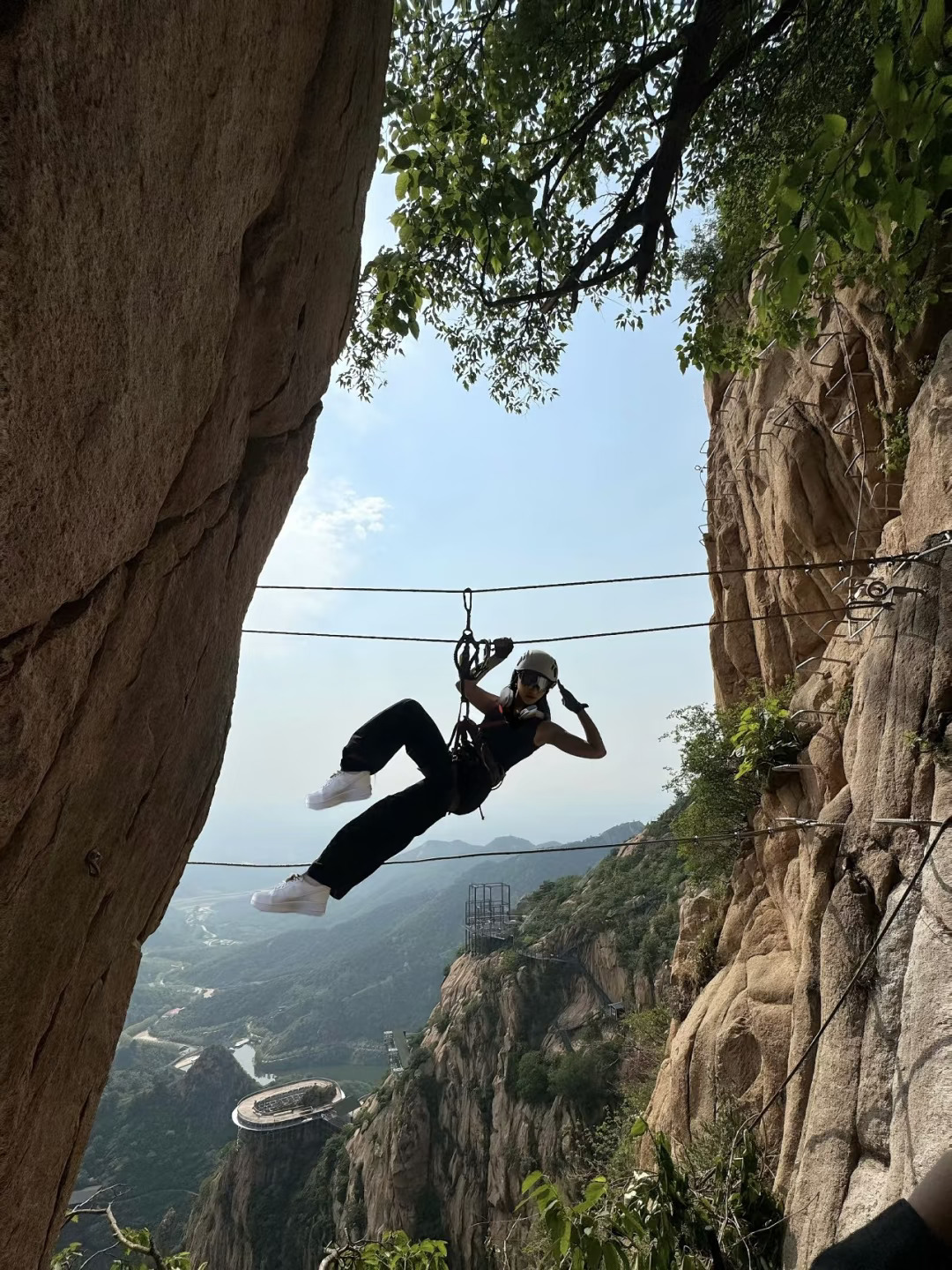 谁说秦皇岛只有海边能玩? 这次在龙云谷体验了一把飞拉达,简直刷新了我的肾上腺素上限!😱 站在悬崖上抓着铁索攀爬,脚下是百米高空,眼前是绝美山景,这种刺激感真的会上瘾! -