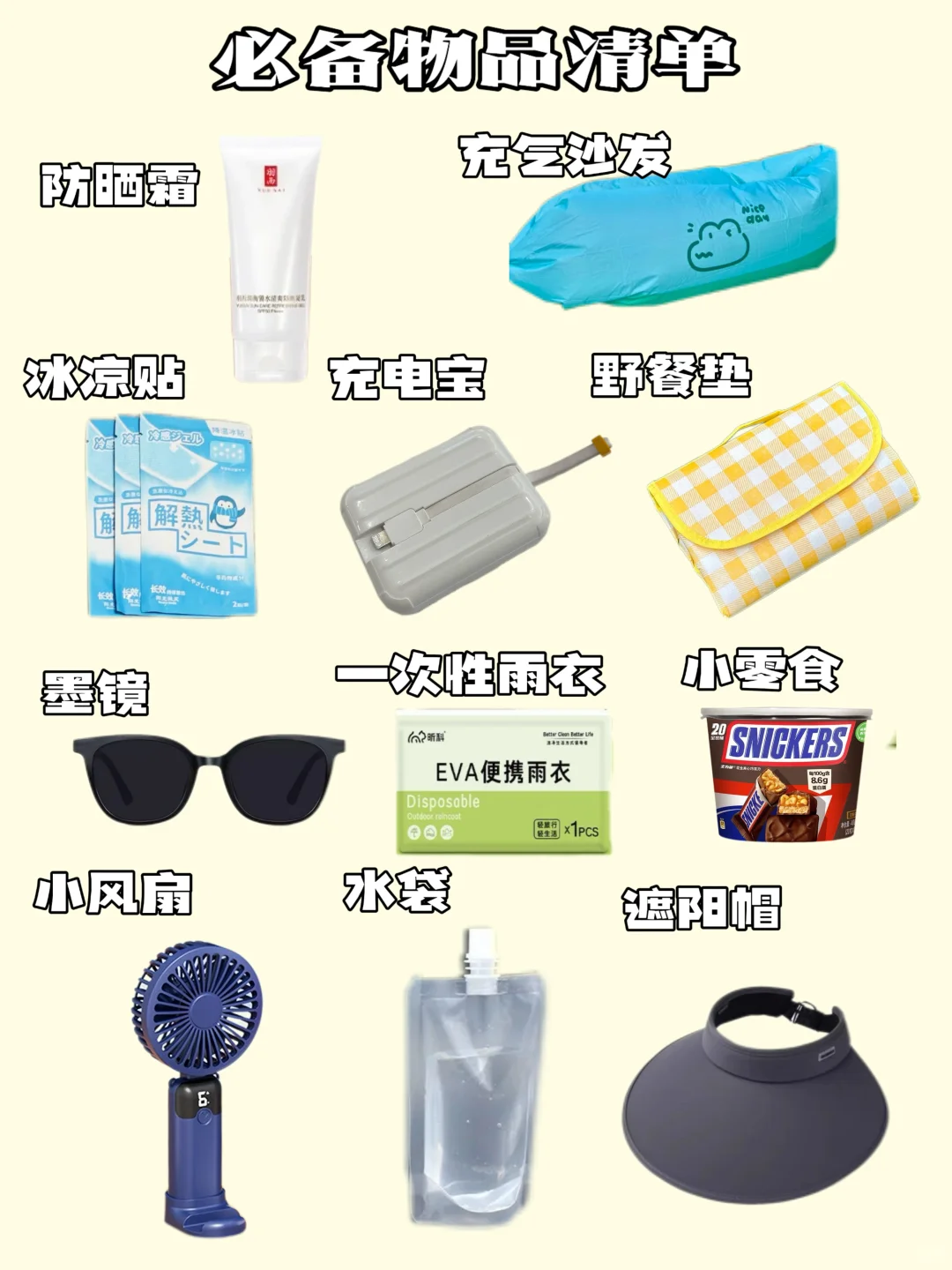 ✔️防晒霜✔️一次性雨衣✔️充电宝✔️野餐垫