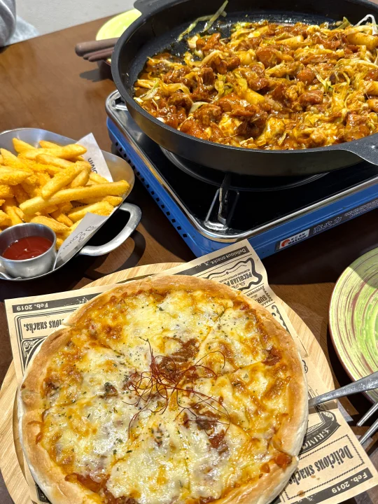 开业的时候跟朋友去吃 真觉得不好吃 但是经常能刷到的姐妹们推荐 我就还想再来 这一次点了跟之前不一样的菜品 披萨🍕可以的 芝士鸡也行 舒芙蕾也不错 就是整体挺好的 最好吃的就是赠送的薯条🍟哈哈哈哈哈哈 这个薯条是我最近吃过最好吃的薯条啦