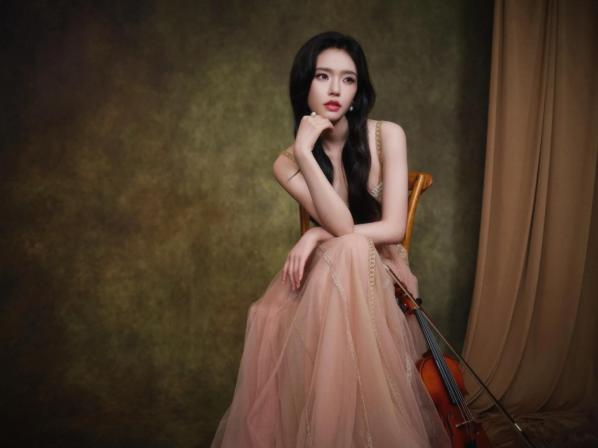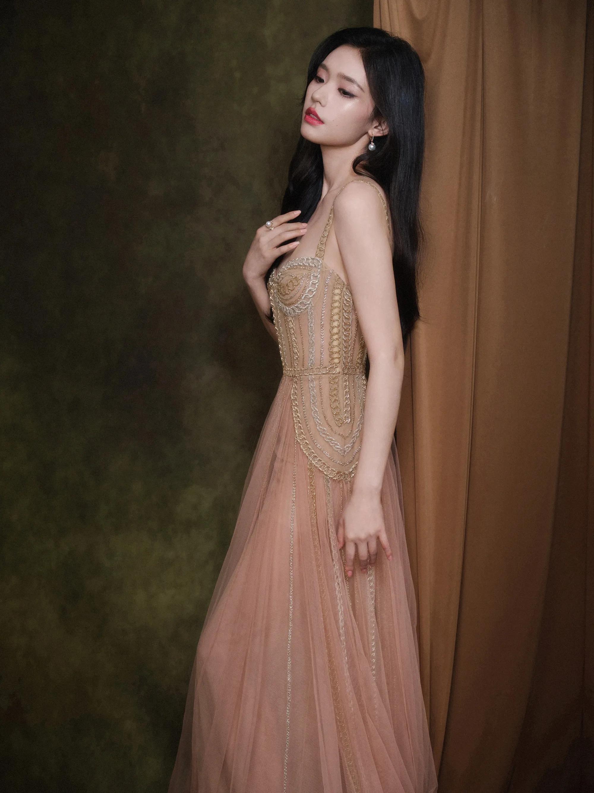 林允鎏金粉抹胸礼裙,古典油画走出来的大美女
