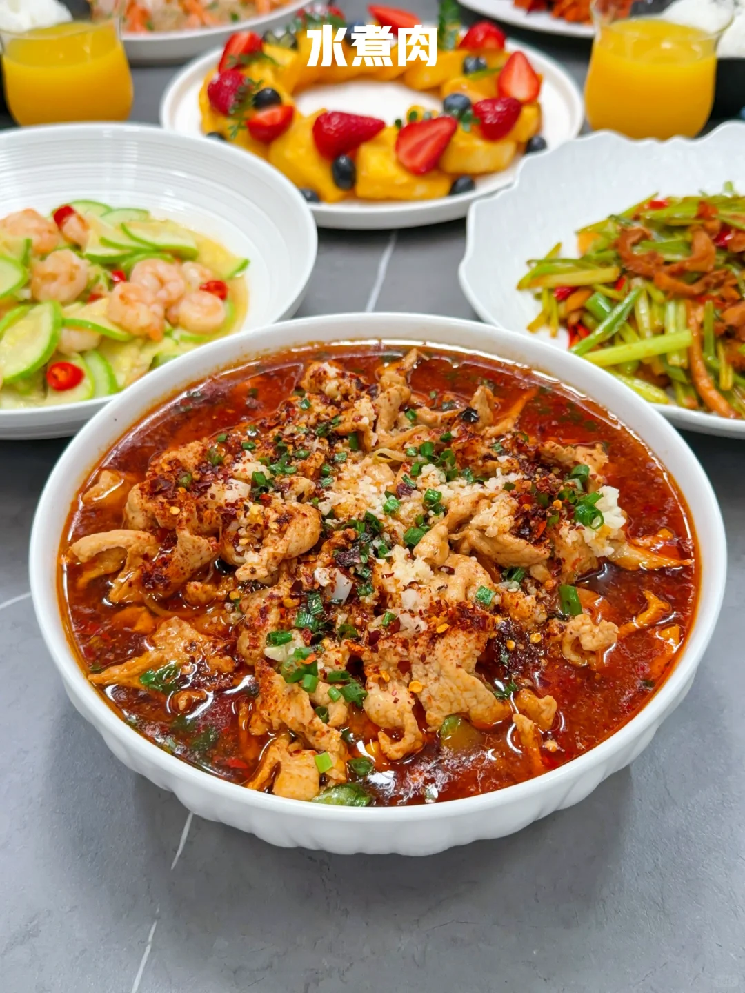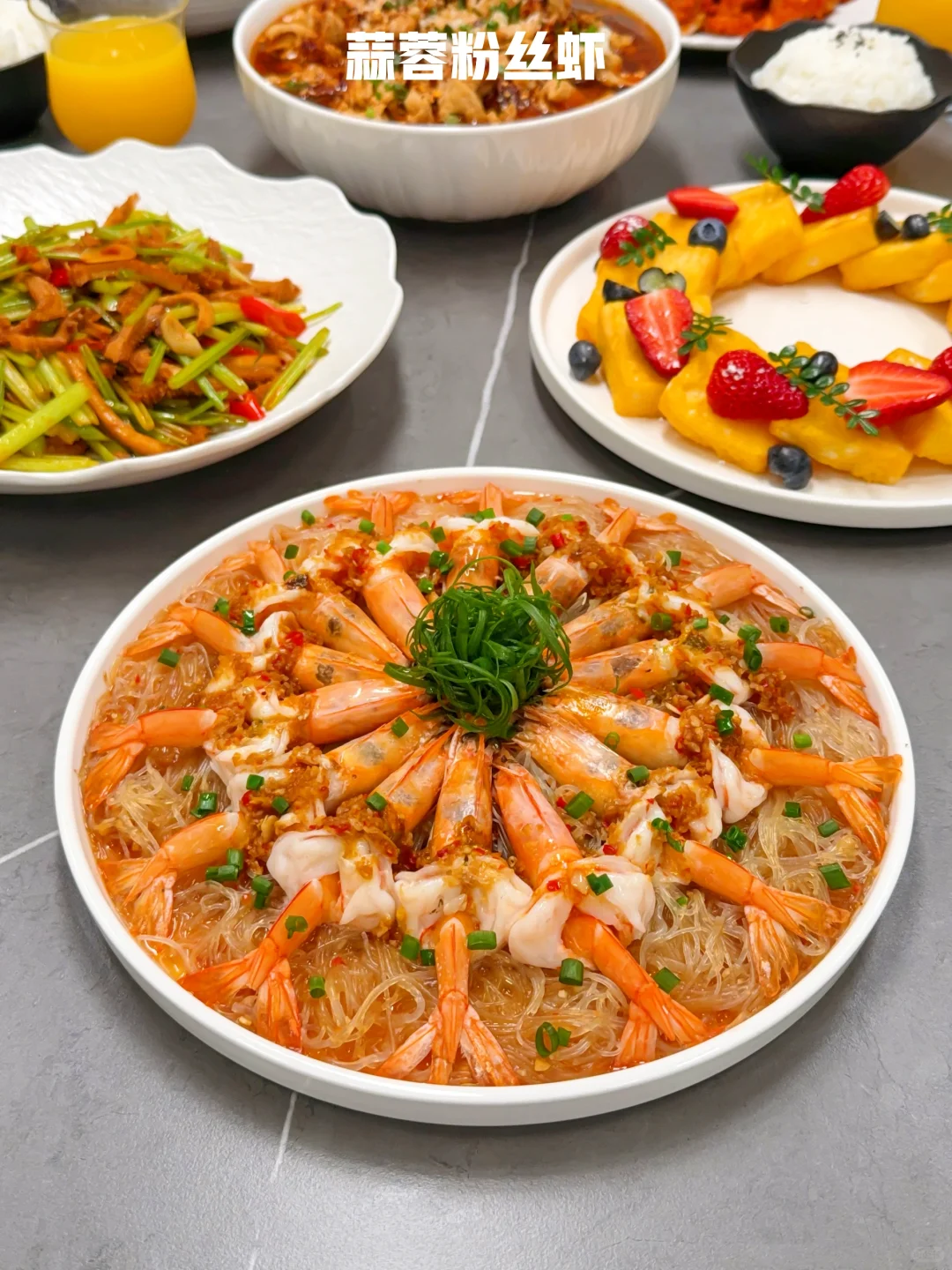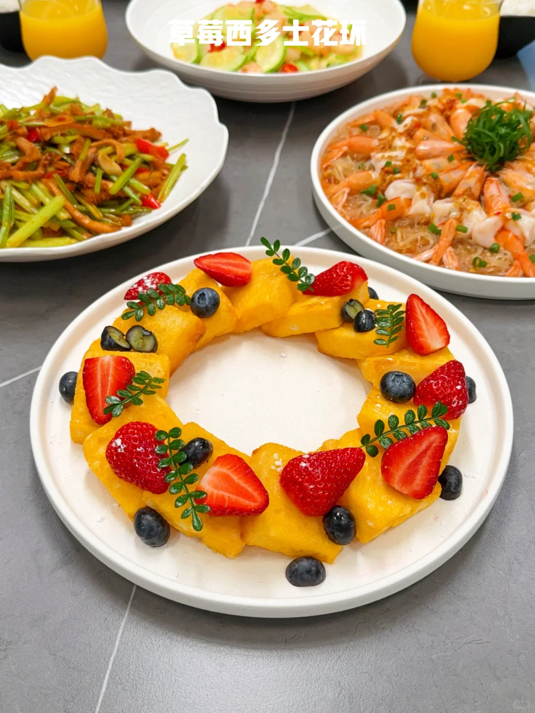 大热天的是谁还在厨房做饭啊~ 那个肯下厨做饭的人,一定是爱你的人 🌈今日菜单分享: ❶【蒜蓉粉丝虾】 ❷【水煮肉】 ❸【香芹炒牛肚】 ❹【西葫芦炒虾仁】 ❺【辣子鸡】 ❻【草莓西多士花环】 🍓水果:草莓&芭乐&蓝莓