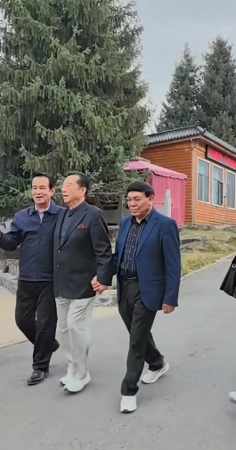 86岁李双江到新疆天山池风景区旅游,一路有人搀扶,老婆跟在旁边,偶尔也搀扶一下他