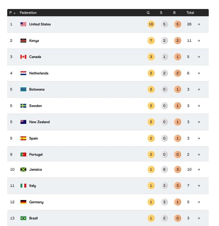 1,美国(16金5银5铜,26枚奖牌) 2,肯尼亚(7金2银2铜,11枚奖牌) 3,加拿大(3金1银1铜,5枚奖牌) 4,荷兰(2金2银2铜,6枚奖牌) 5,瑞典(2金1铜,3枚奖牌) 5,新西兰(2金1铜,3枚奖牌) 5,西班牙(2金1铜,3枚奖牌) 5,博茨瓦纳(2金1铜,3枚奖牌) 东京田径世锦赛落幕奖牌榜top5如上