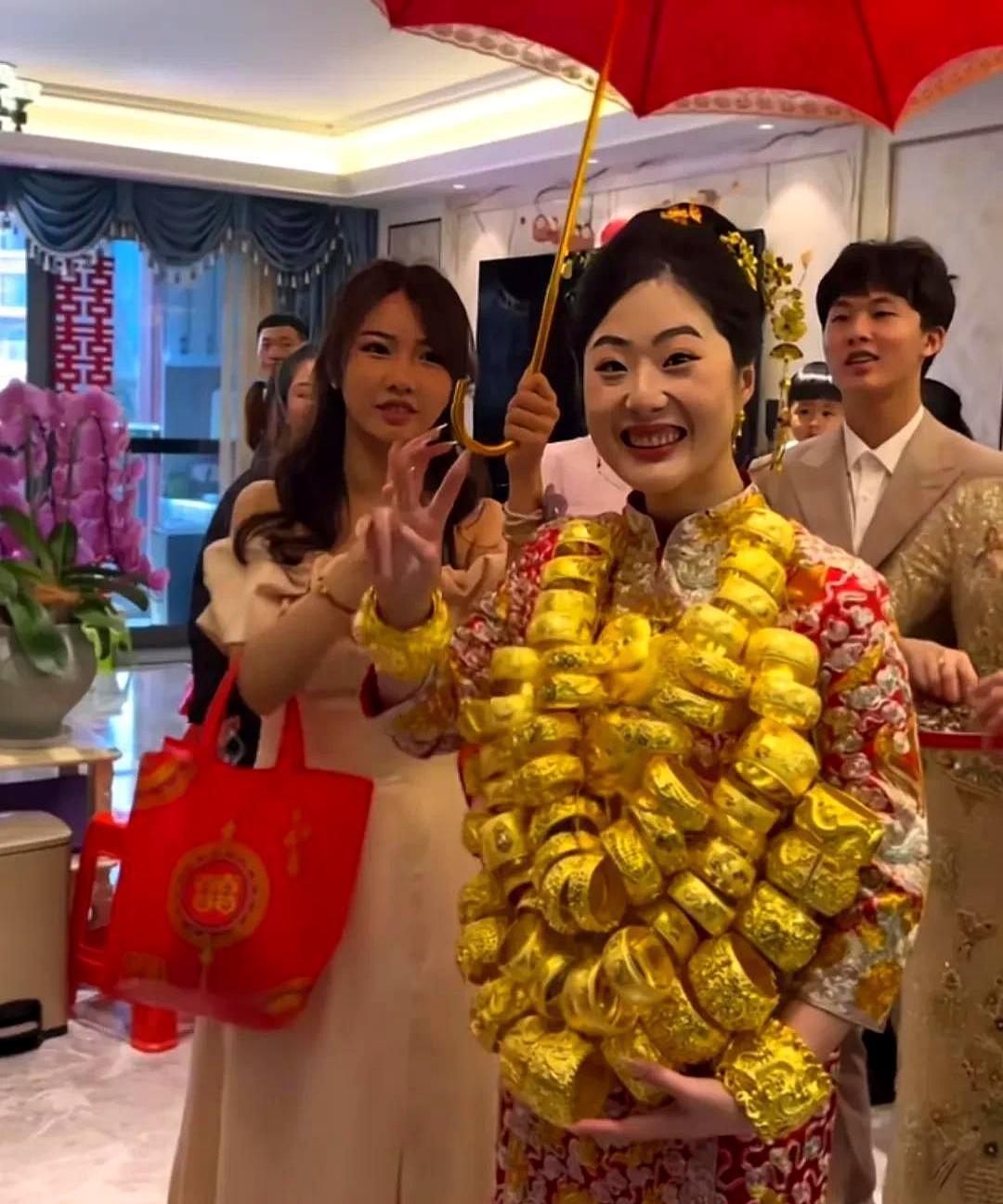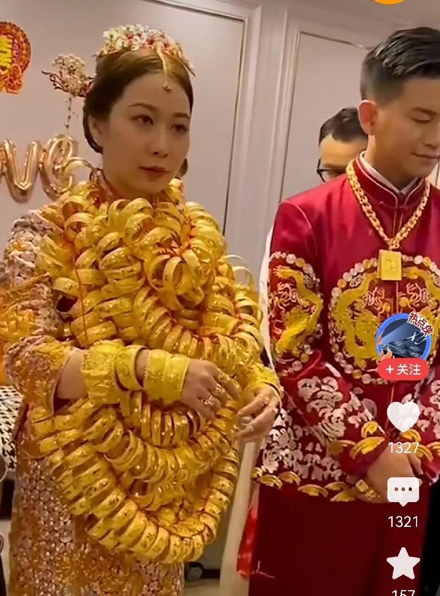 新娘浑身长满了金镯子,居然把眼睛都遮住了! 当初我还以为这图是p的,没想到却是真的。见过新娘挂镯子的,没见过挂这么多的。脖子能受得了吗? 另外,这些饰品都是纯金的吗?是自己买的还是亲戚朋友送的呀?这一身得值多少钱啊?我挺好奇的,有明白人可以来说说。 感觉南方人嫁女真的太豪横了,金店都得上他家进货吧。 年少的我,曾嫌弃黄金俗气,如今却渴望成为那俗世之人。随着岁月增长,越发钟爱那抹金色光芒。