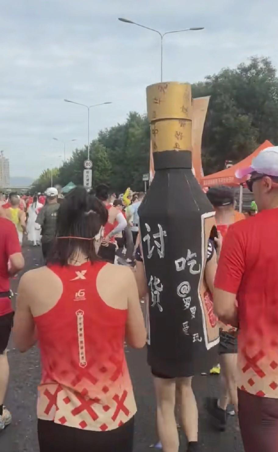 太原国际马拉松比赛惊现一个“讨吃货”。 太原马拉松的流量太大了,有想法的人绝对不能错过这个机会。看看这个身背模型酒瓶上写“讨吃货”的马拉松队员是博尽了大赛的眼博,成为太原街头一道亮丽的风景线,比5.5万美元都让人惊艳,比黑人军团都让人注目,彰显个性和卖点,体现了太原马拉松的自由和包容,使太原马拉松皆具幽默诙谐,而又不失大气,太原马拉松真的成了