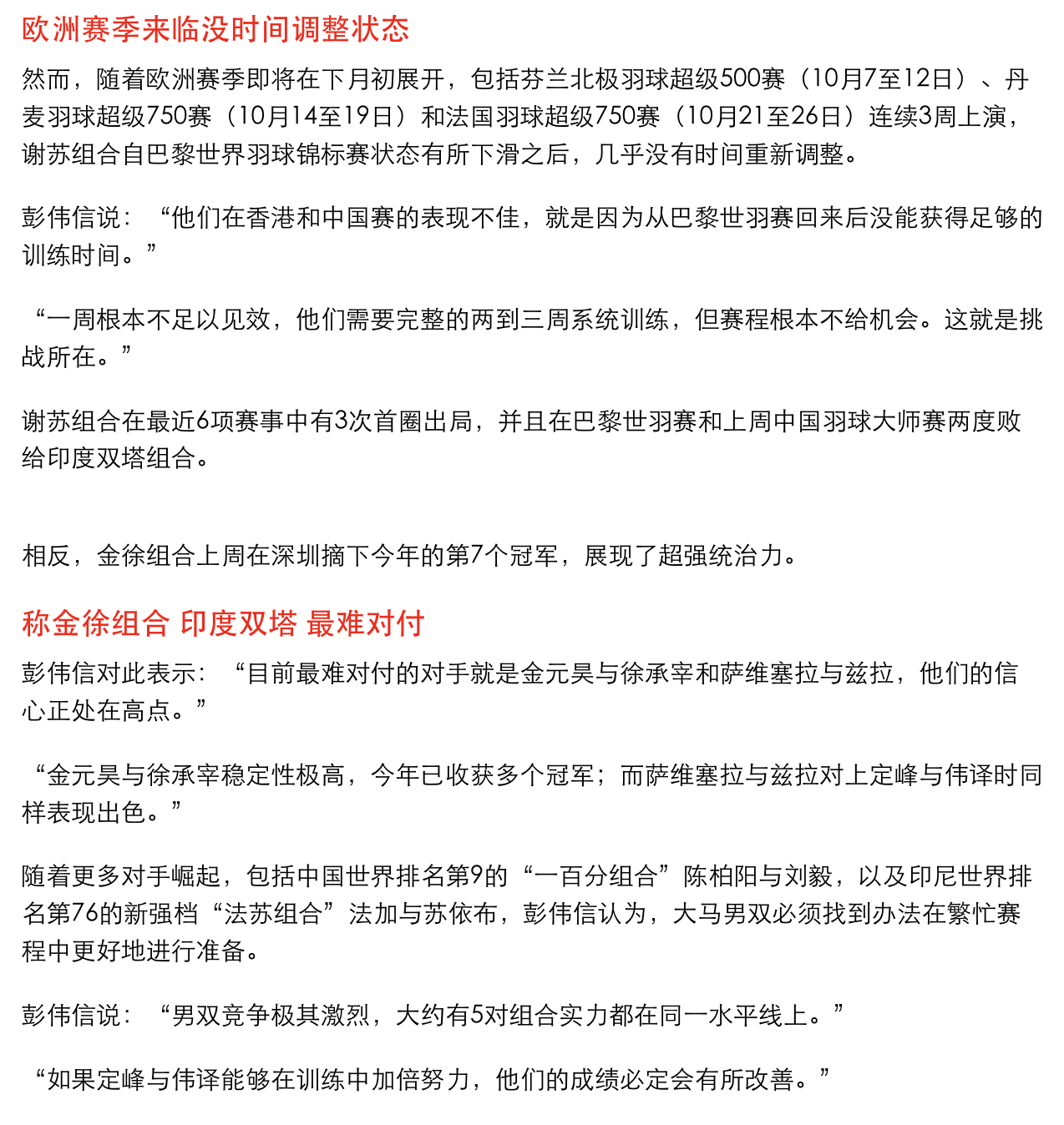 【彭伟信:紧凑赛程影响训练周期 谢苏提升状态面临挑战】